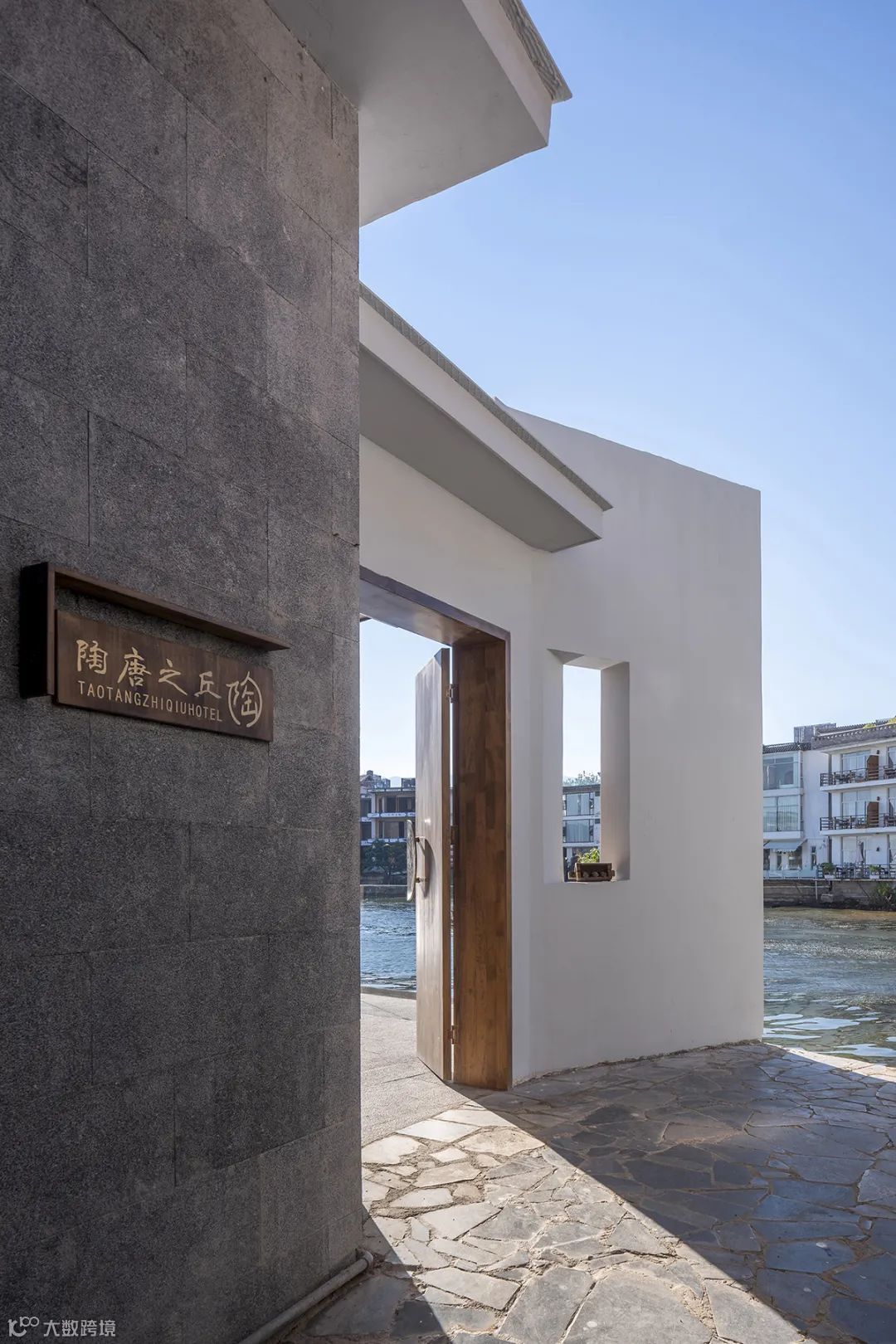 ▲海景房院门,自然材料与当代材料之间的对撞