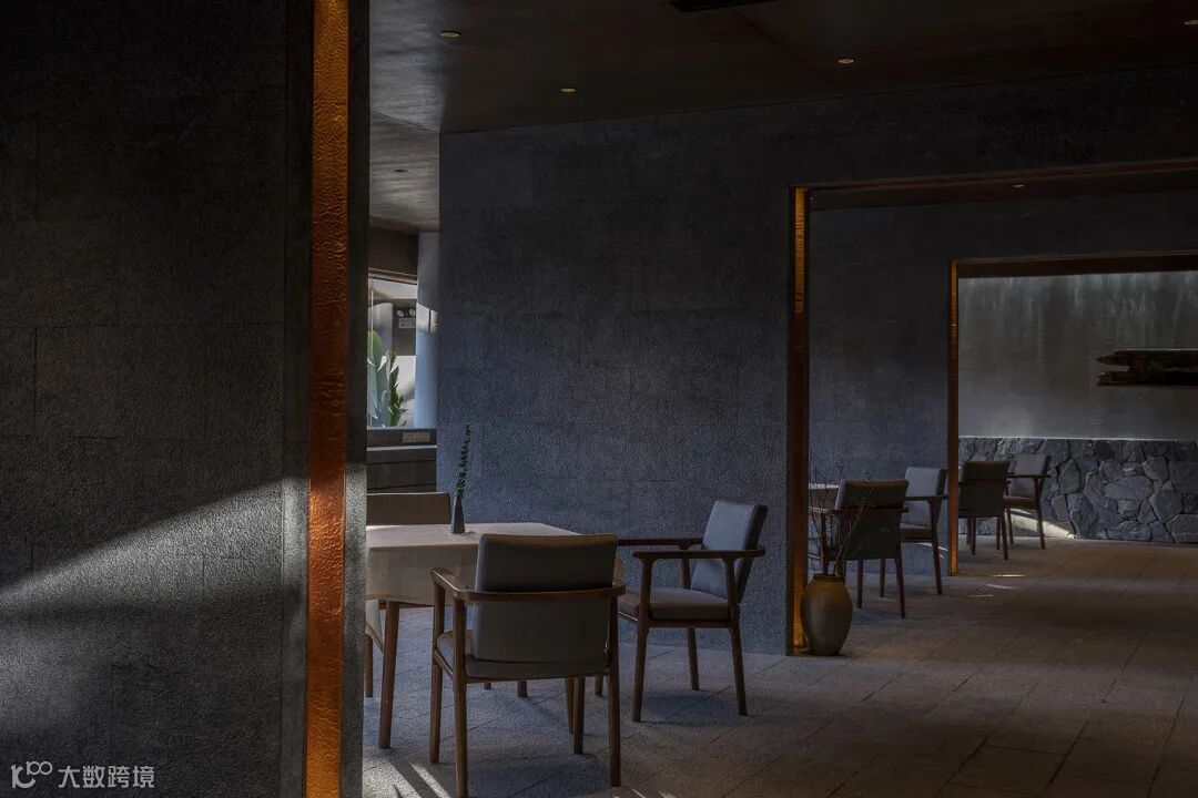 餐厅空间以当地石材和深色木饰面作为主要材料。对于原空间墙体的开洞形成了新的序列组合,形成空间的序列感。餐台处落地窗刻意压低高度,将庭院景色框入长卷中。洞口的收边用大理匠人的手工锤纹铜板勾勒,铜板在射灯的照射下,凹凸的造型上流动着紫红色的光。主墙的水纹灯饰及老木船形象将波光掠影的海面景观进行了重新的诠释。这些都回应了地域的文脉。设计尝试将自然肌理、匠人手工、现代科技三者相结合,寻求一种内心与视觉的双重享受。