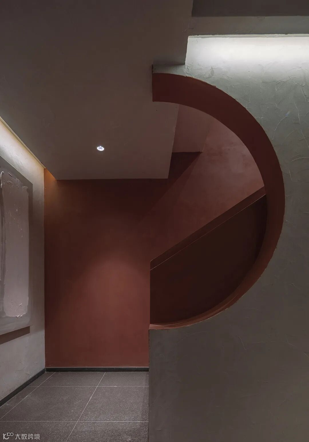 ▲暗红色的楼梯从半圆形墙洞探出