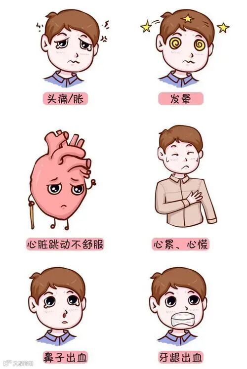 同时注意自己是否出现胸前疼痛、心慌心悸、胸闷憋喘、头晕头痛、眼前发黑、全身乏力等心脑血管疾病的症状。