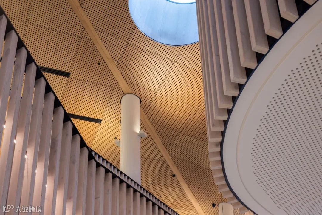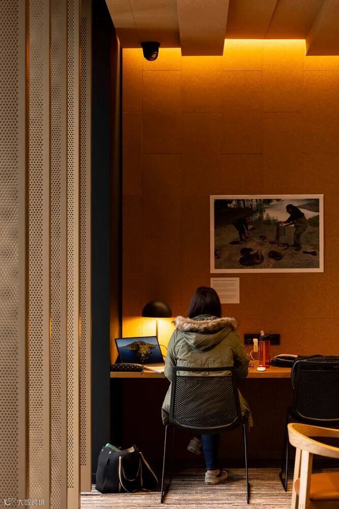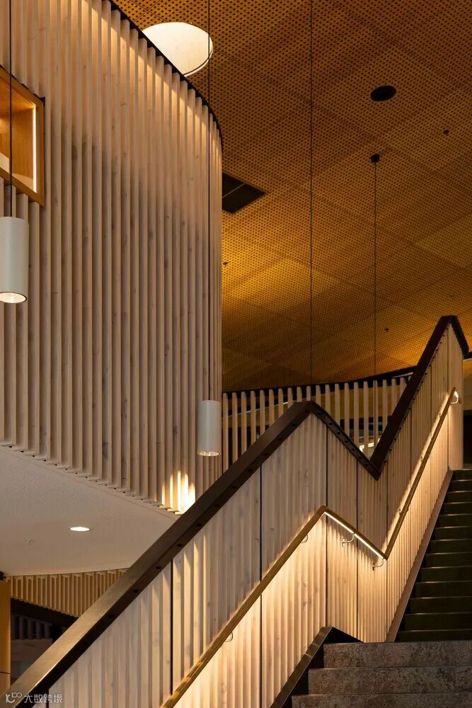 采用了丰富和温暖的色调。灰色和绿色的特色地毯创造了整个空间的趣味性和区域性,而折叠的木皮天花板沿着上面的屋顶线连续流过,这里有主要的图书馆藏品、合作区,一个安静的反思研究室,通过参考宝盒的概念与文化叙事相联系。