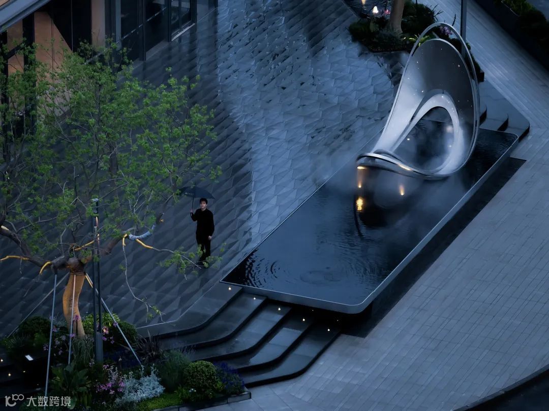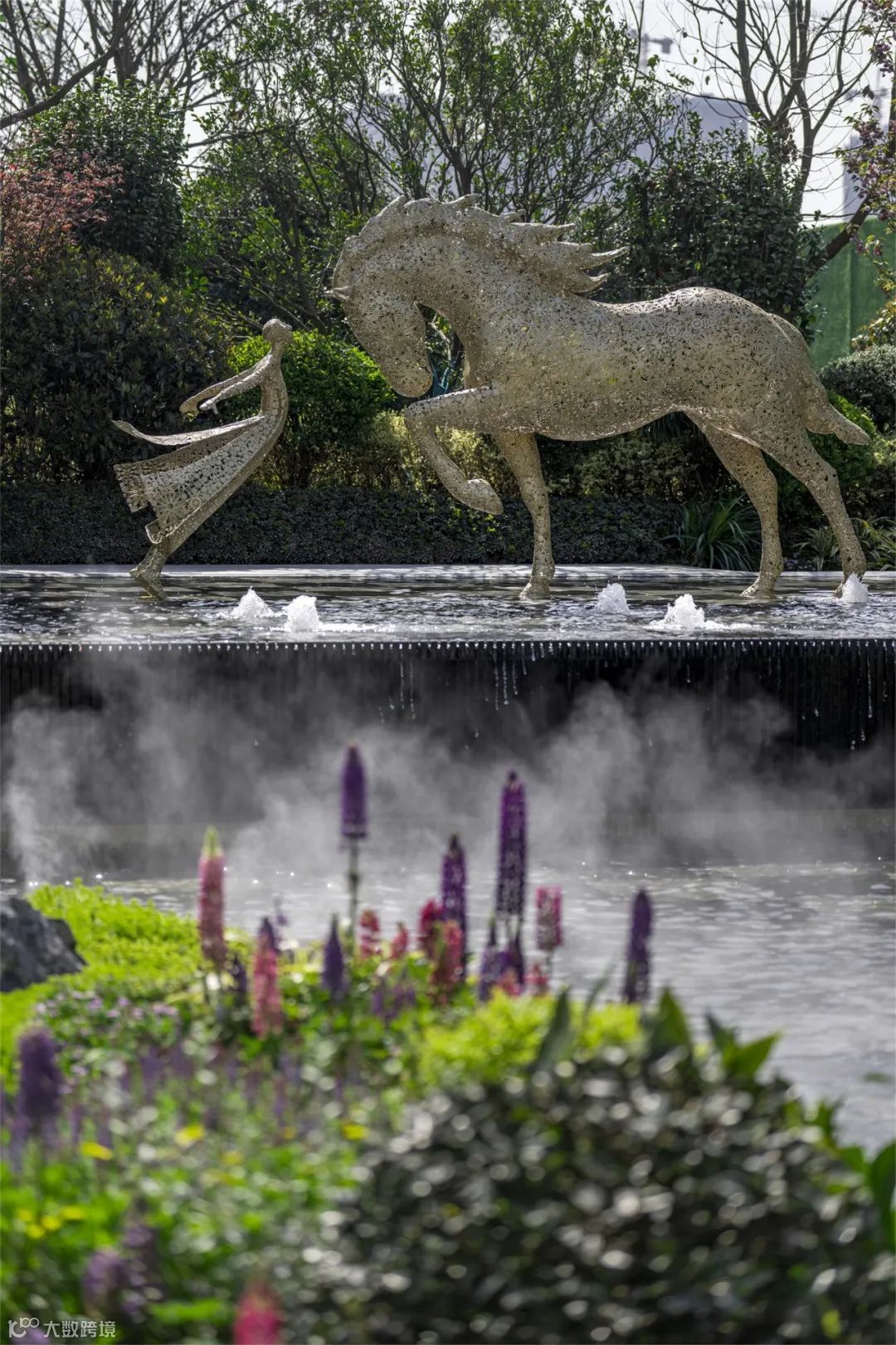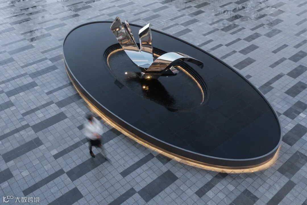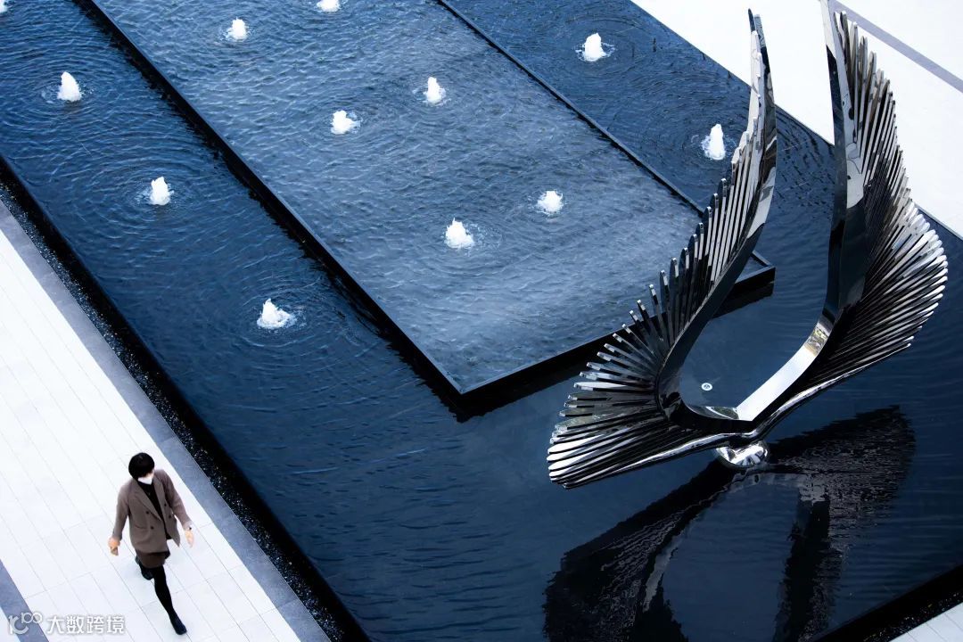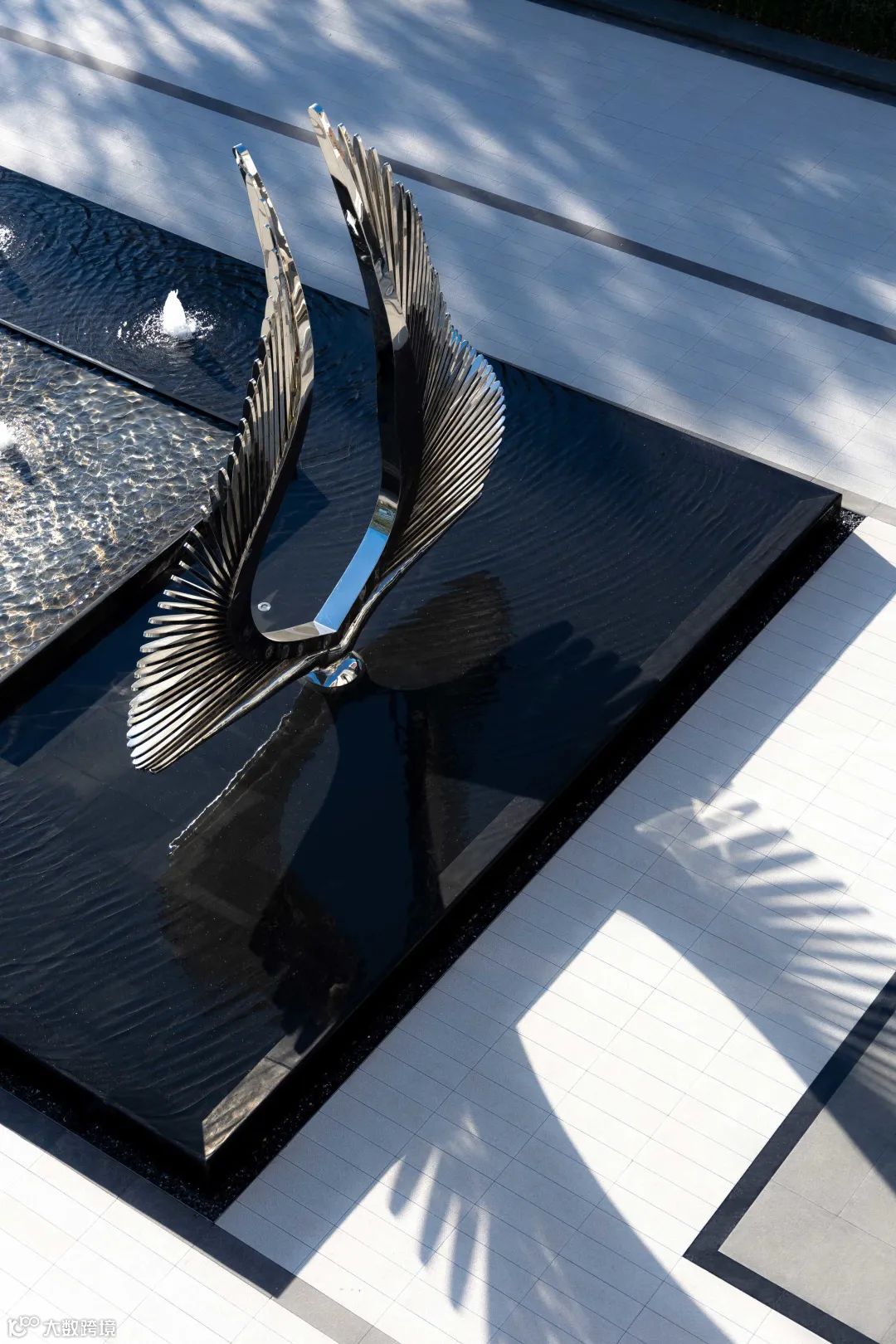 自然涌泉,内涵宁静、悠远,与一侧“飞翔之翼”水景雕塑,动静交织,动性和秩序感丰富了空间层次,在视觉上呈现出强烈的韵律美,演绎都市与自然、建筑与生活的美丽邂逅。