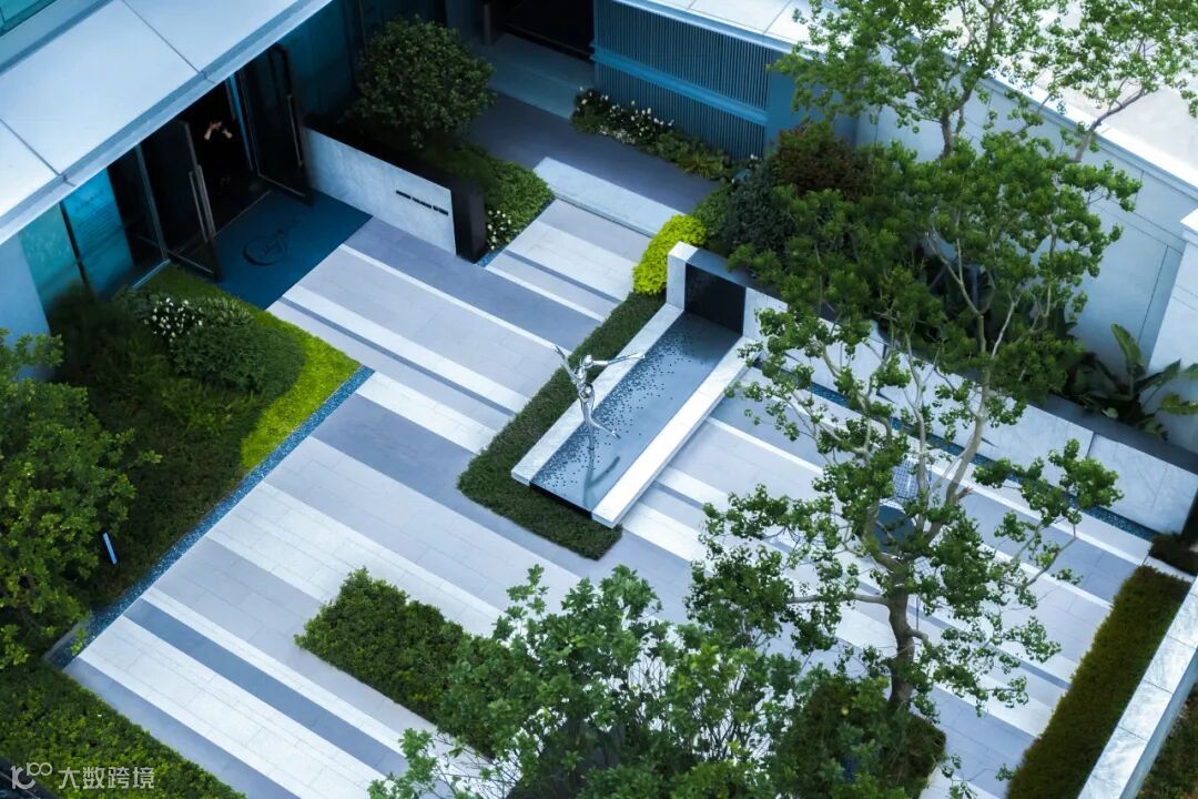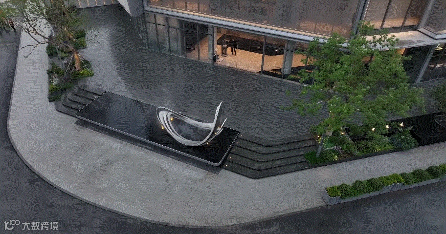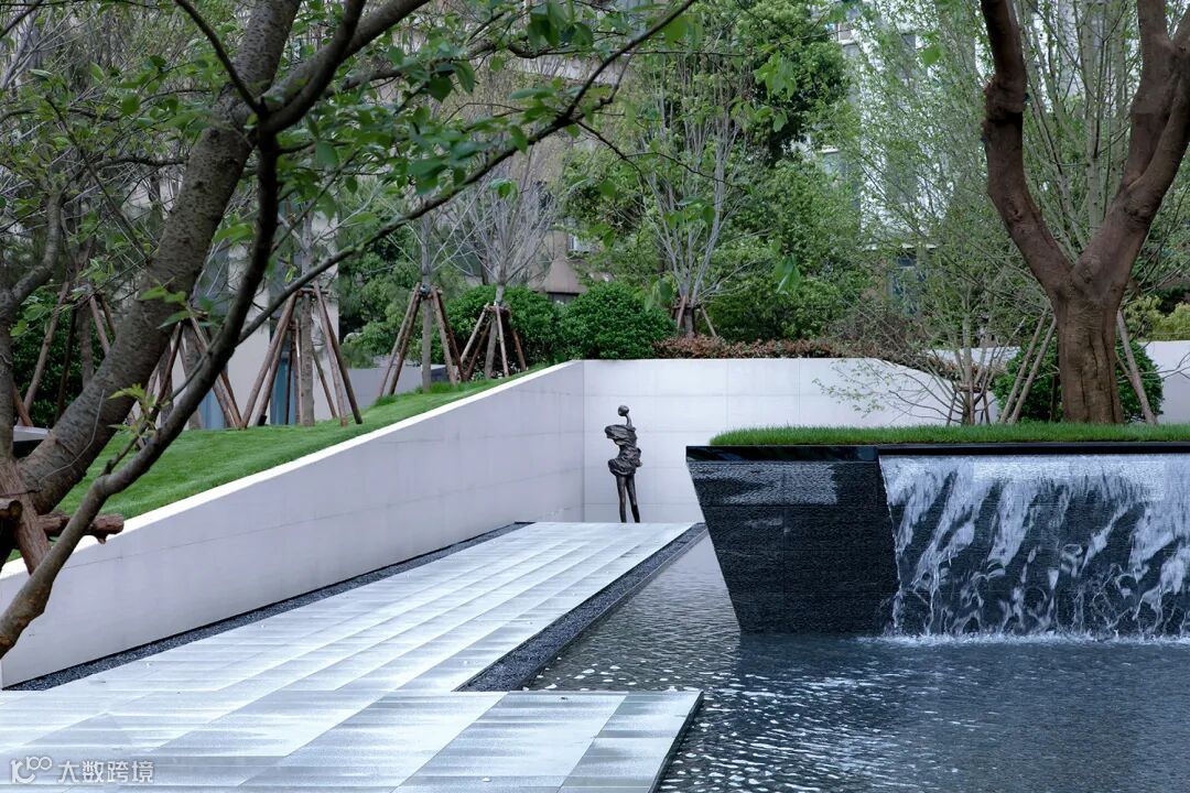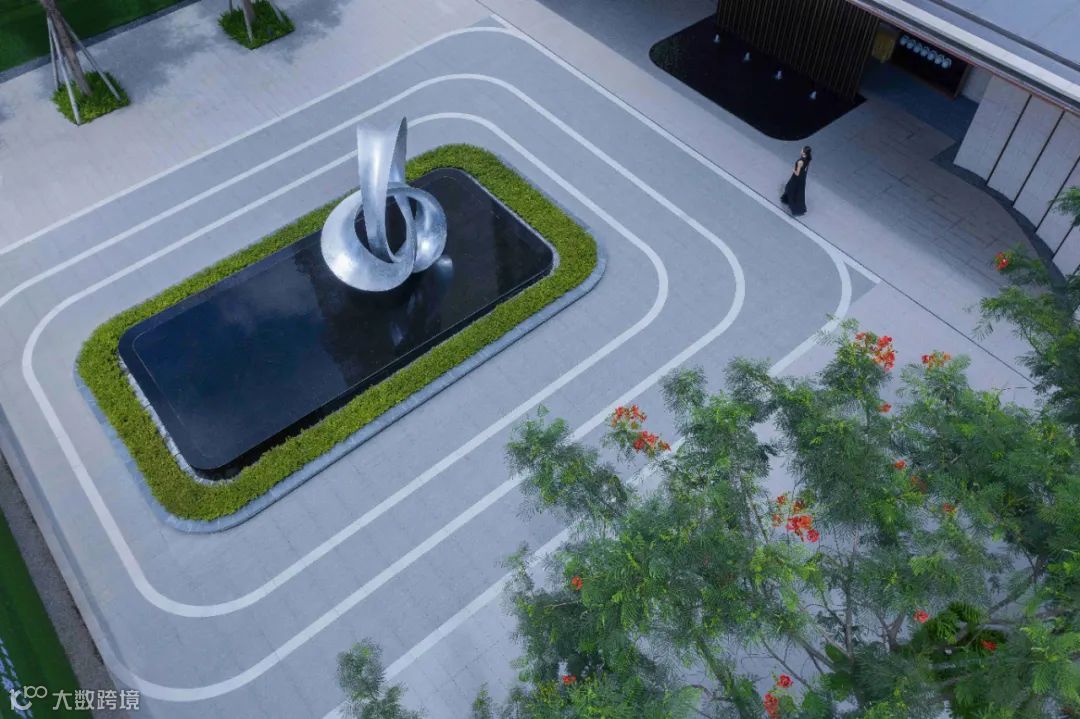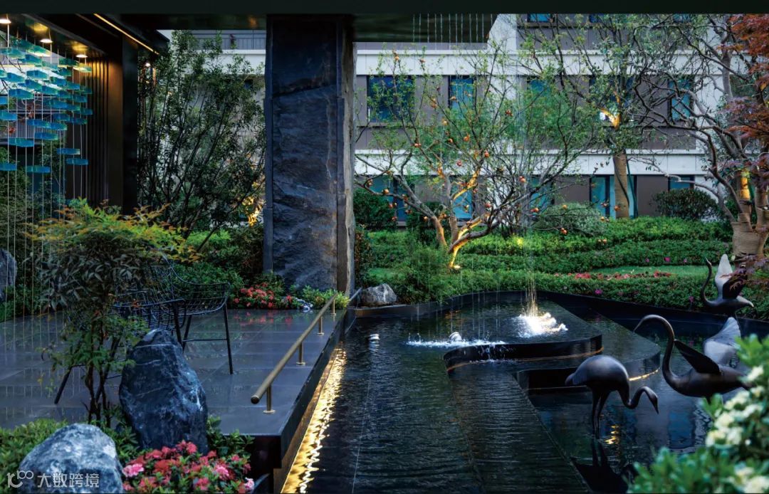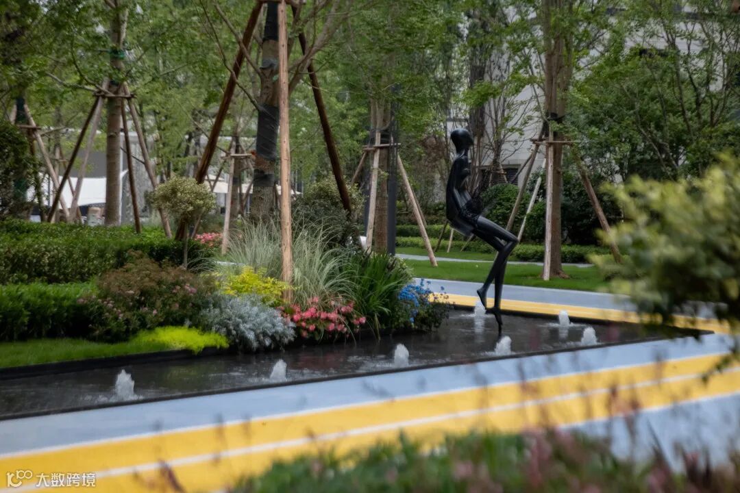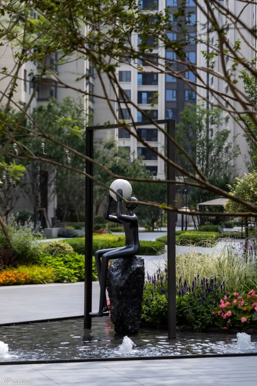 自然涌泉,内涵宁静、悠远,与一侧“飞翔之翼”水景雕塑,动静交织,动性和秩序感丰富了空间层次,在视觉上呈现出强烈的韵律美,演绎都市与自然、建筑与生活的美丽邂逅。