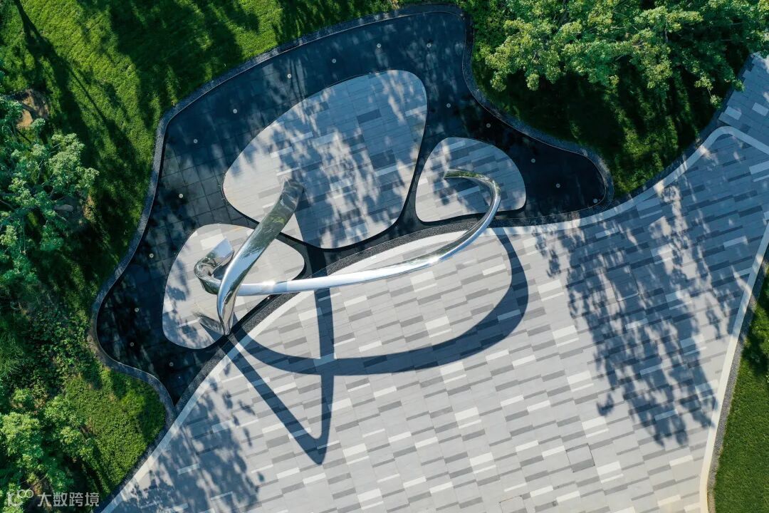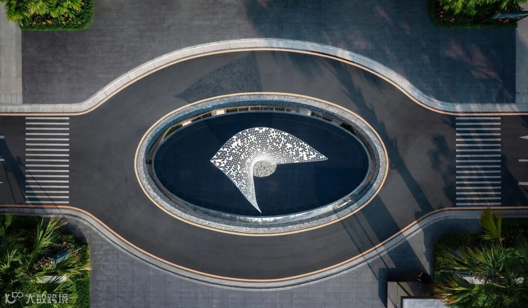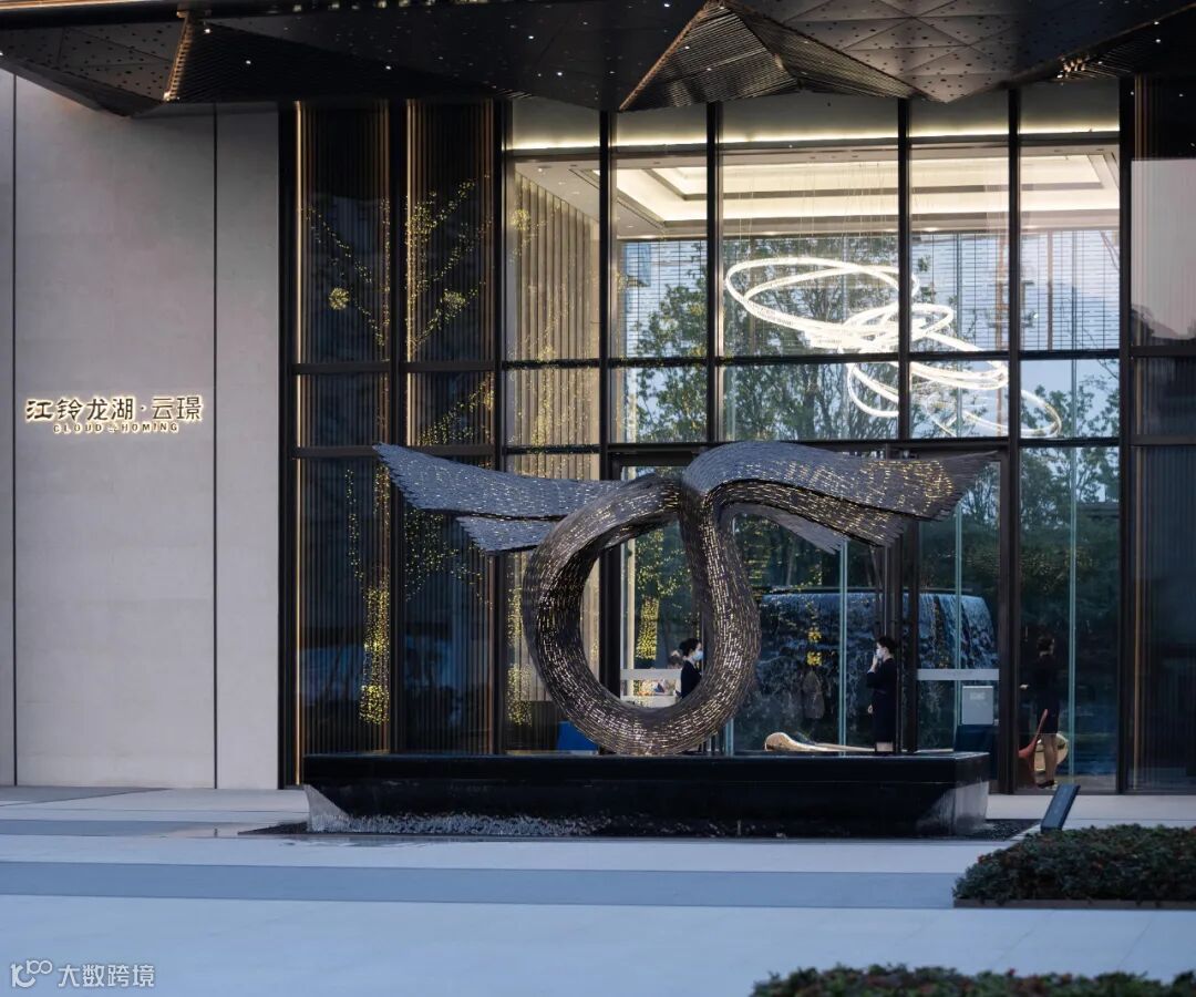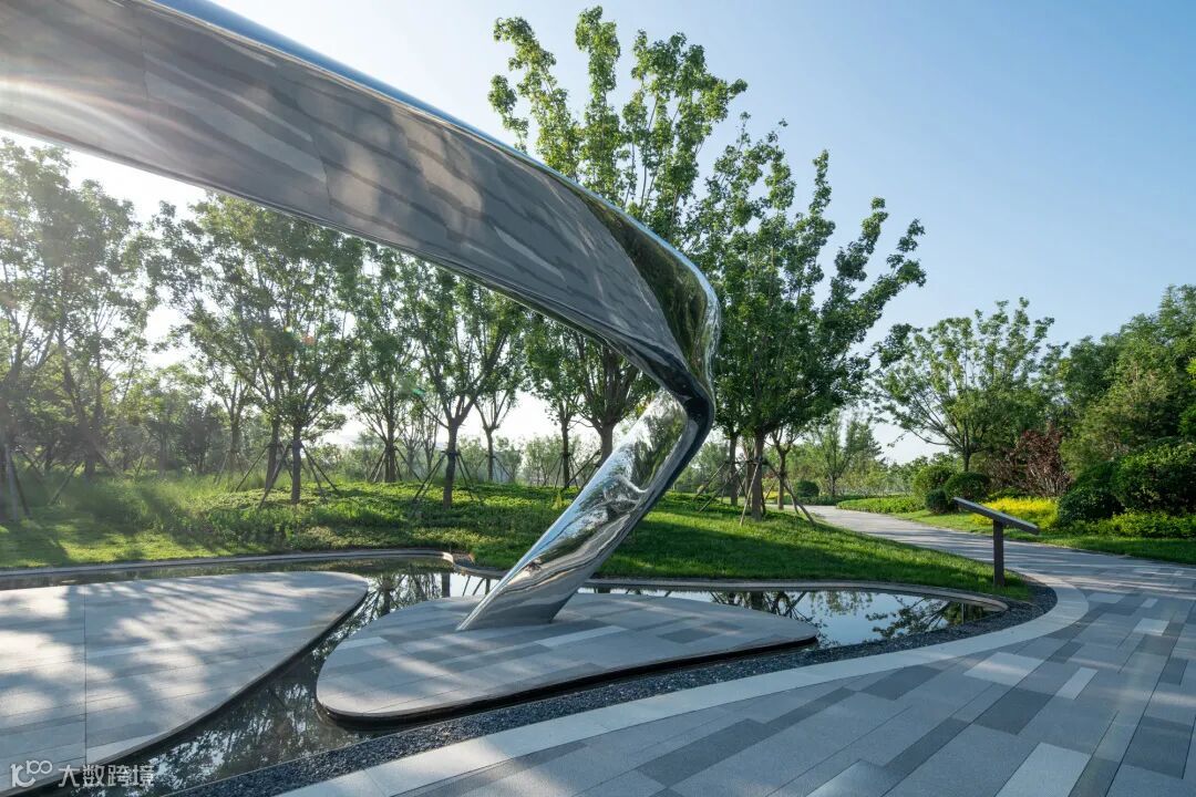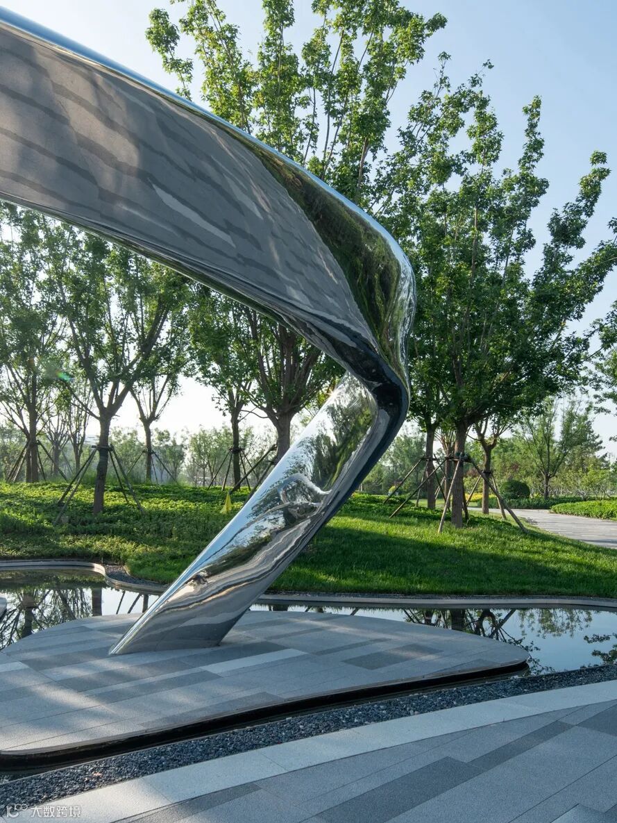 银逸水漾雕塑飘渺自然,其设计取自双湖水脉、入口水渠元素,将自然风光与生活万象有机包容。灵动的异形与建筑的几何构造形成克制而精巧的艺术对比,一弯一合,双舞映水,凝练时光,漾动新生。