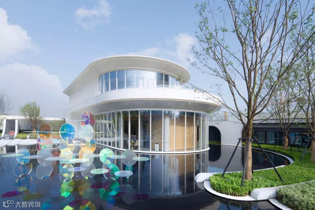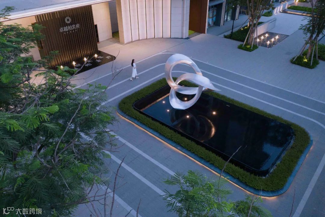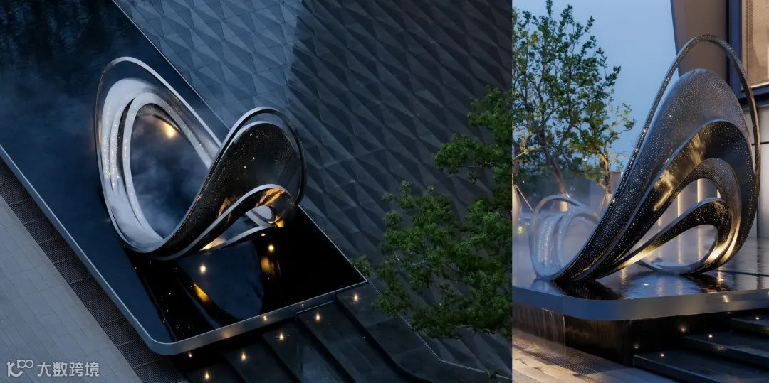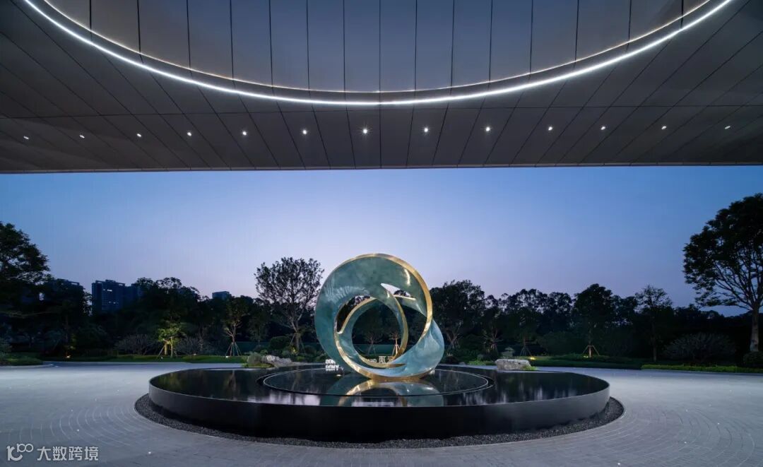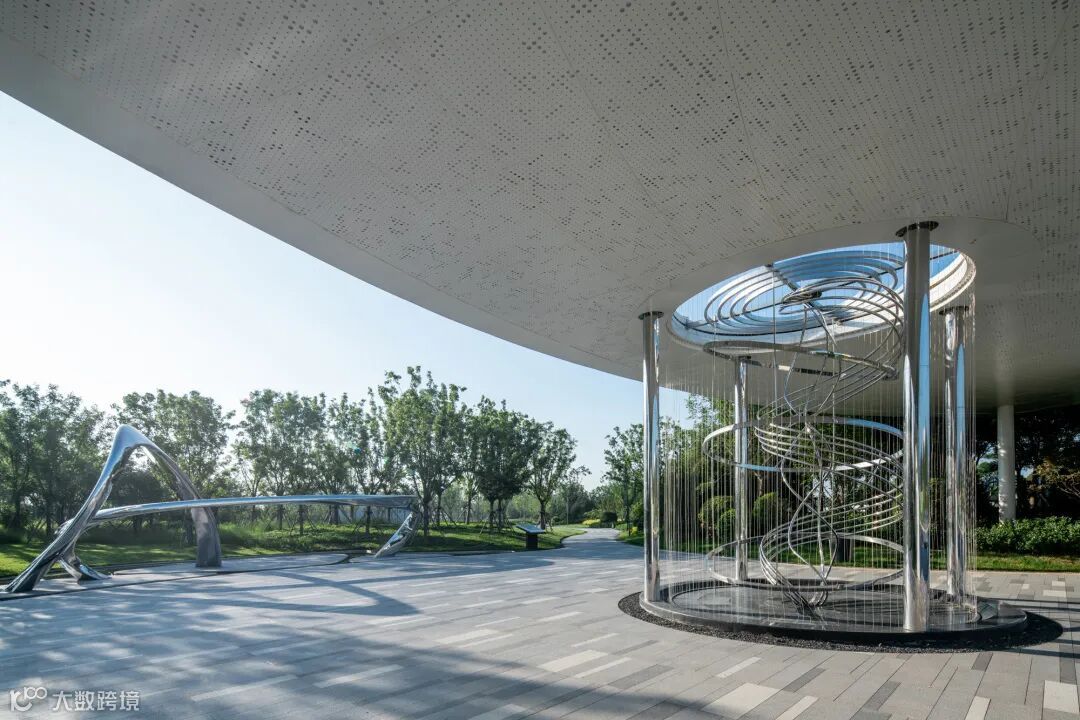 银逸水漾雕塑飘渺自然,其设计取自双湖水脉、入口水渠元素,将自然风光与生活万象有机包容。灵动的异形与建筑的几何构造形成克制而精巧的艺术对比,一弯一合,双舞映水,凝练时光,漾动新生。