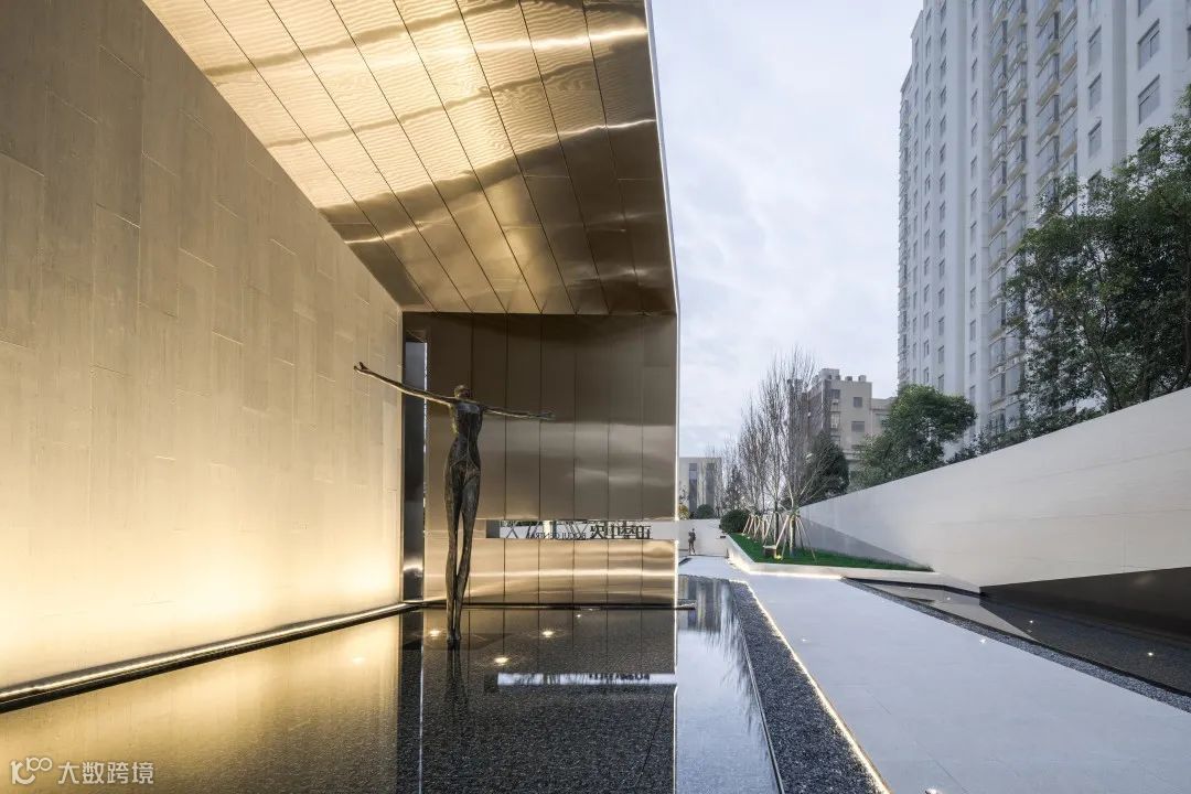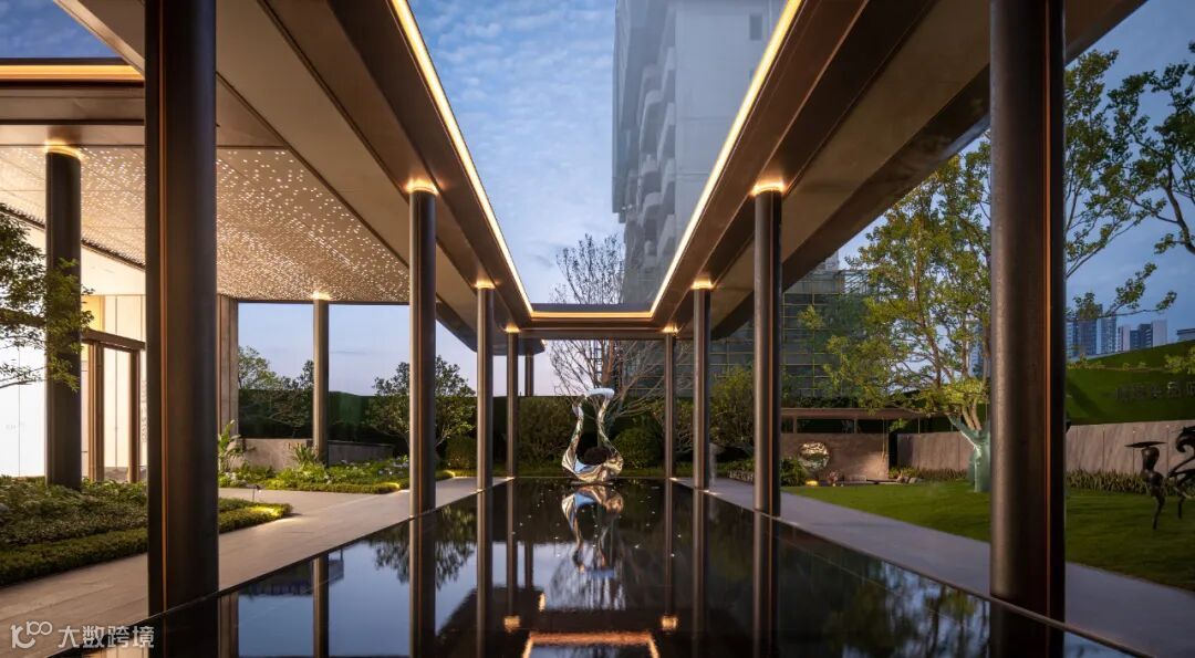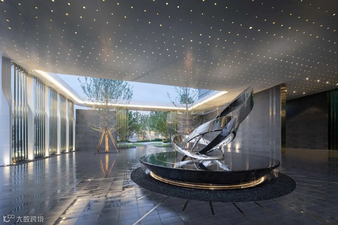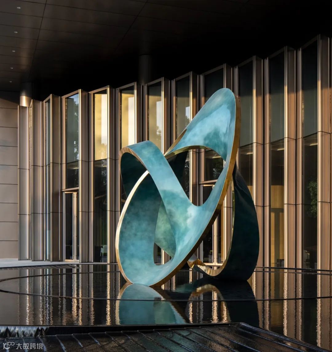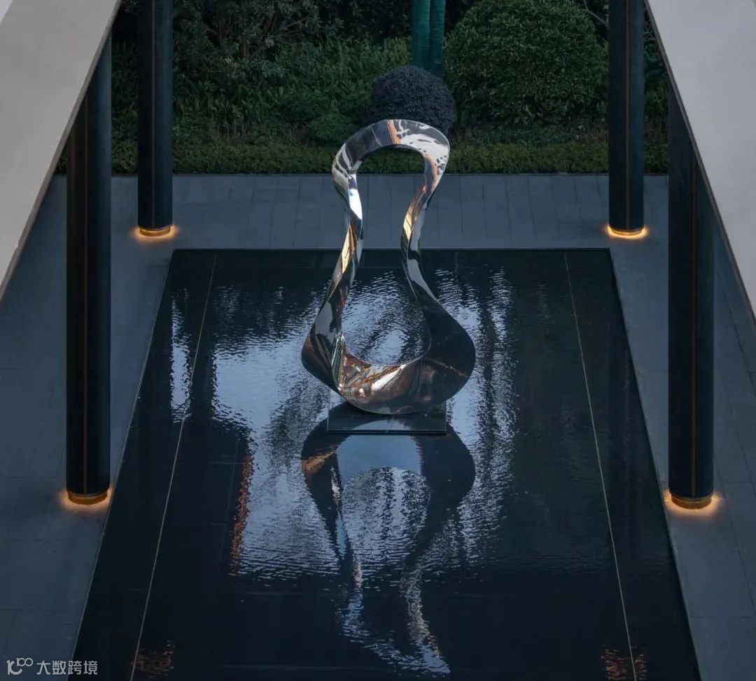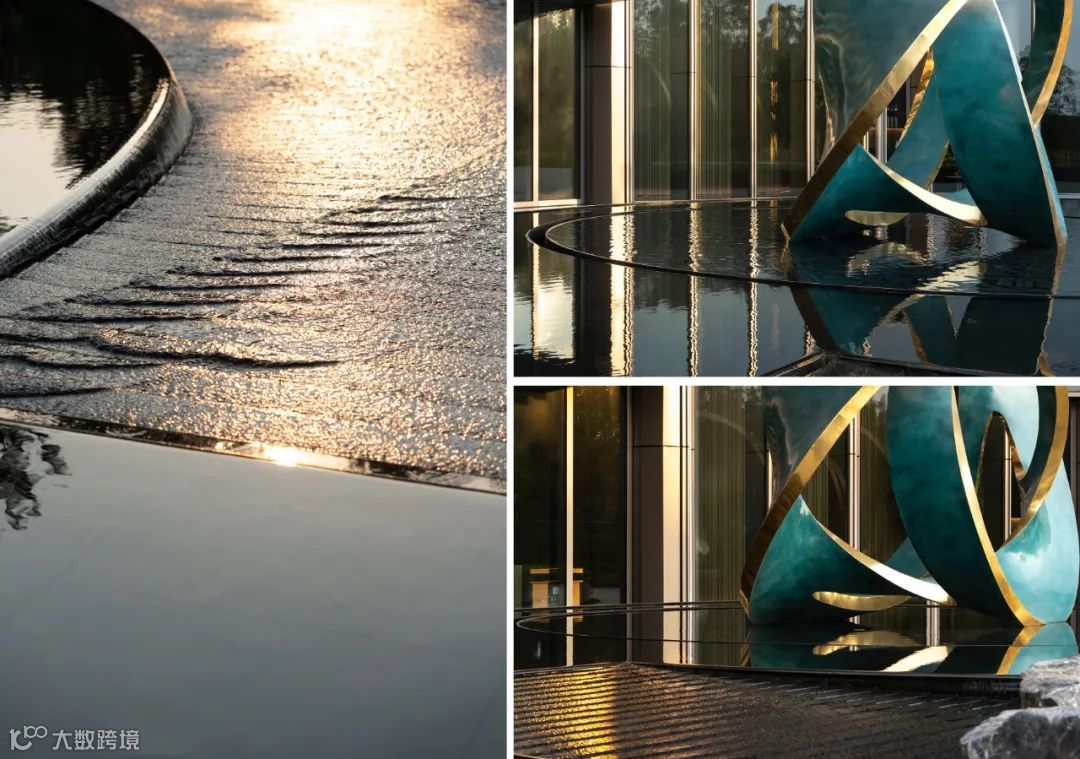 廊内是一池波光粼粼的跌水水景,精致的艺术雕塑在水面上优雅舒展