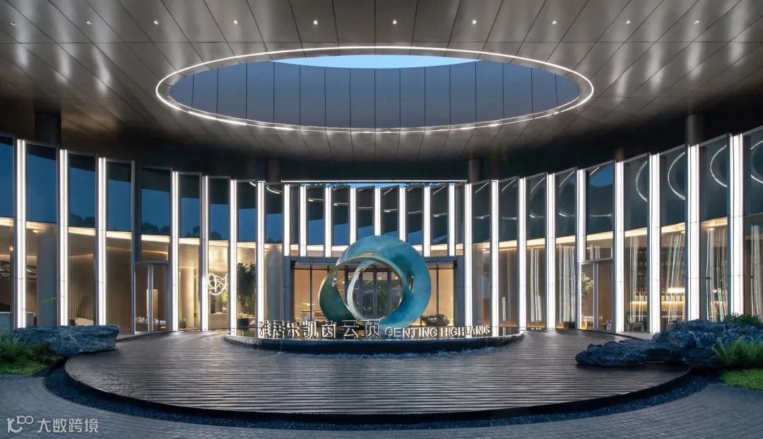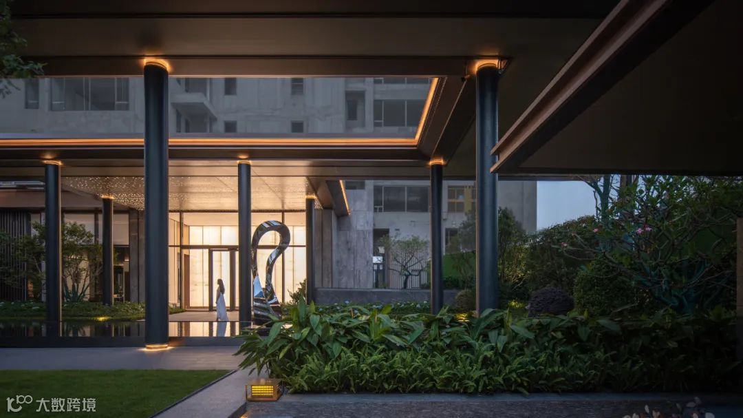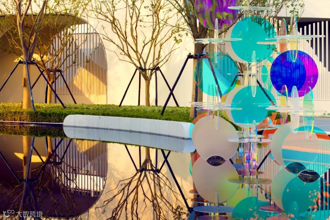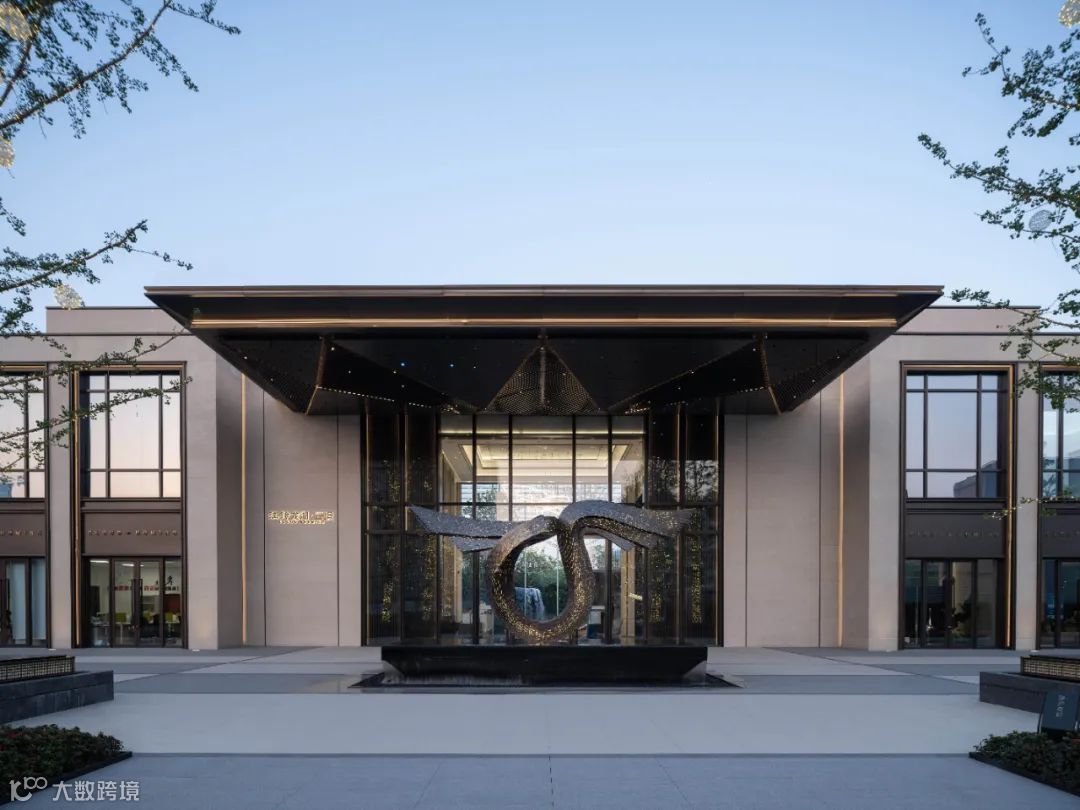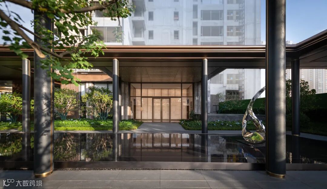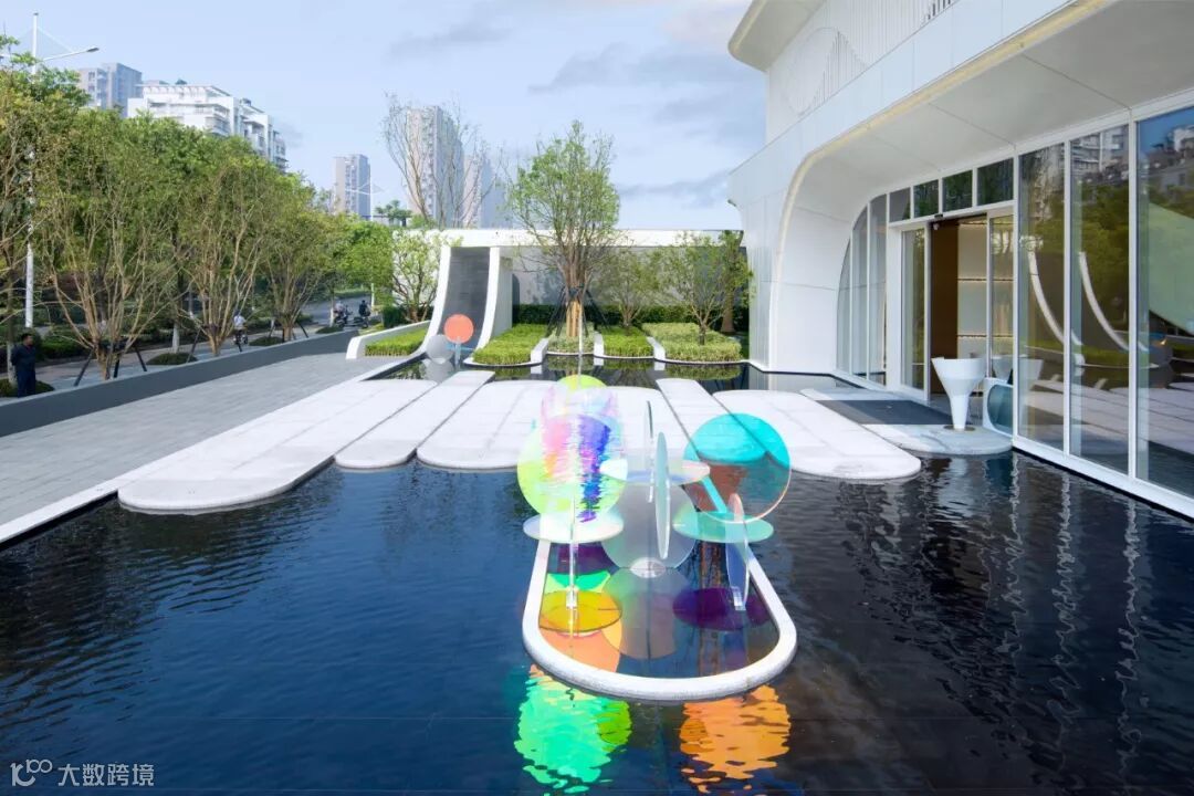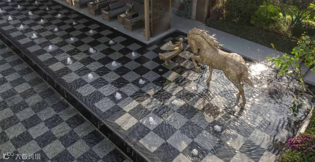 廊内是一池波光粼粼的跌水水景,精致的艺术雕塑在水面上优雅舒展