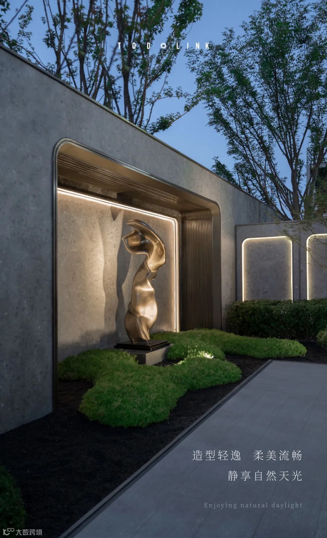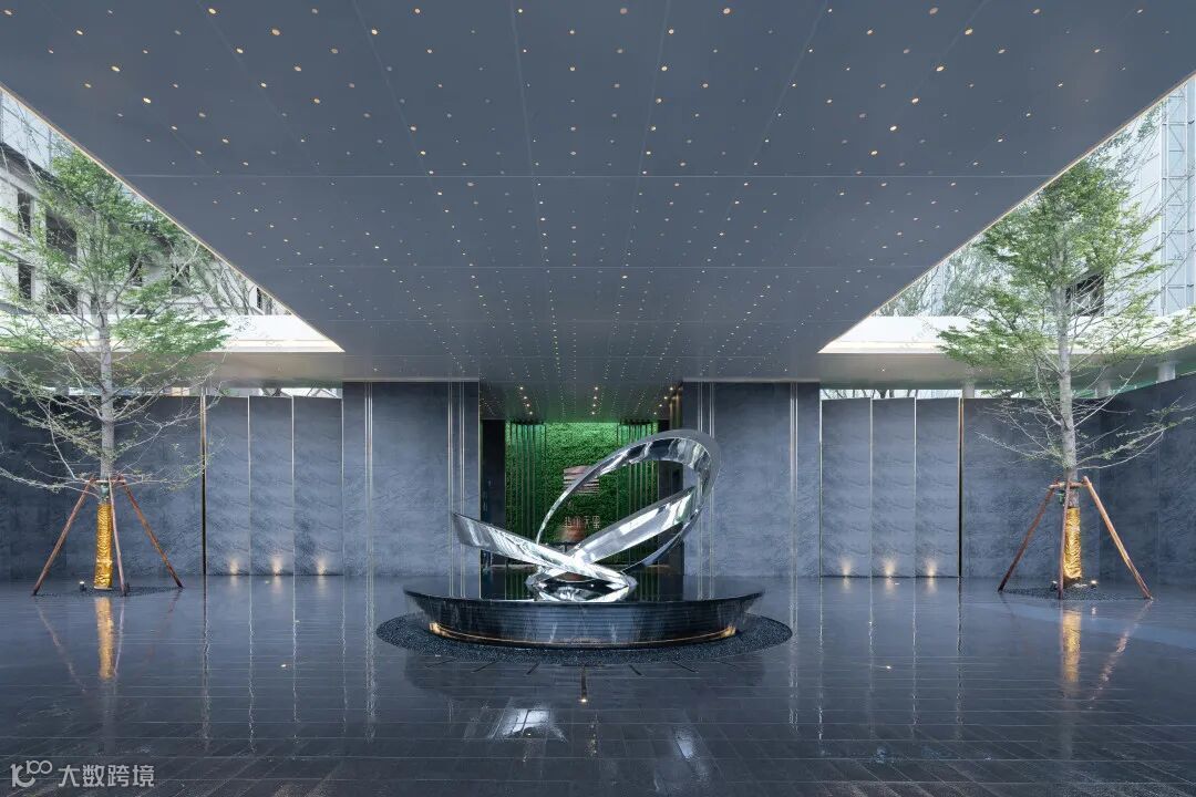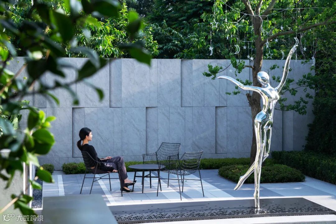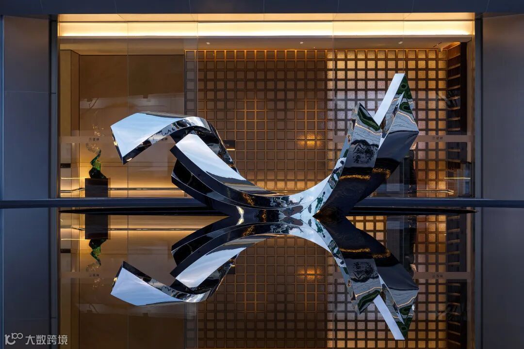 作为两个前后场空间的过渡,打破单一的空间体验与视觉感受。落入翩翩起舞的女孩雕塑,雕塑用镜面不锈钢作为材质表现,却成就一处轻盈之景象。