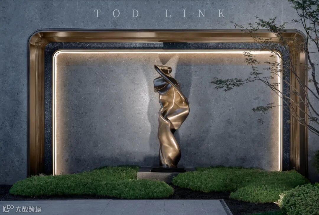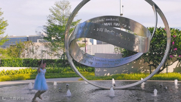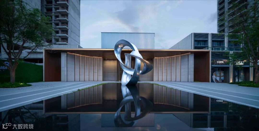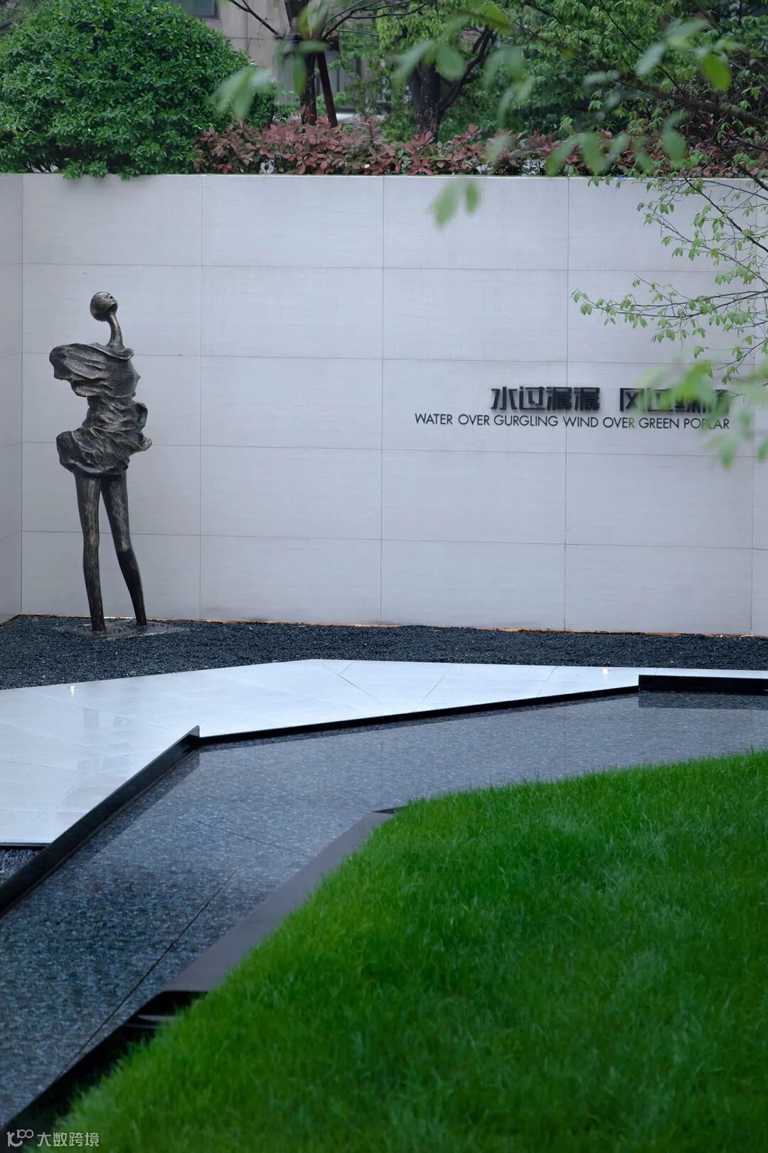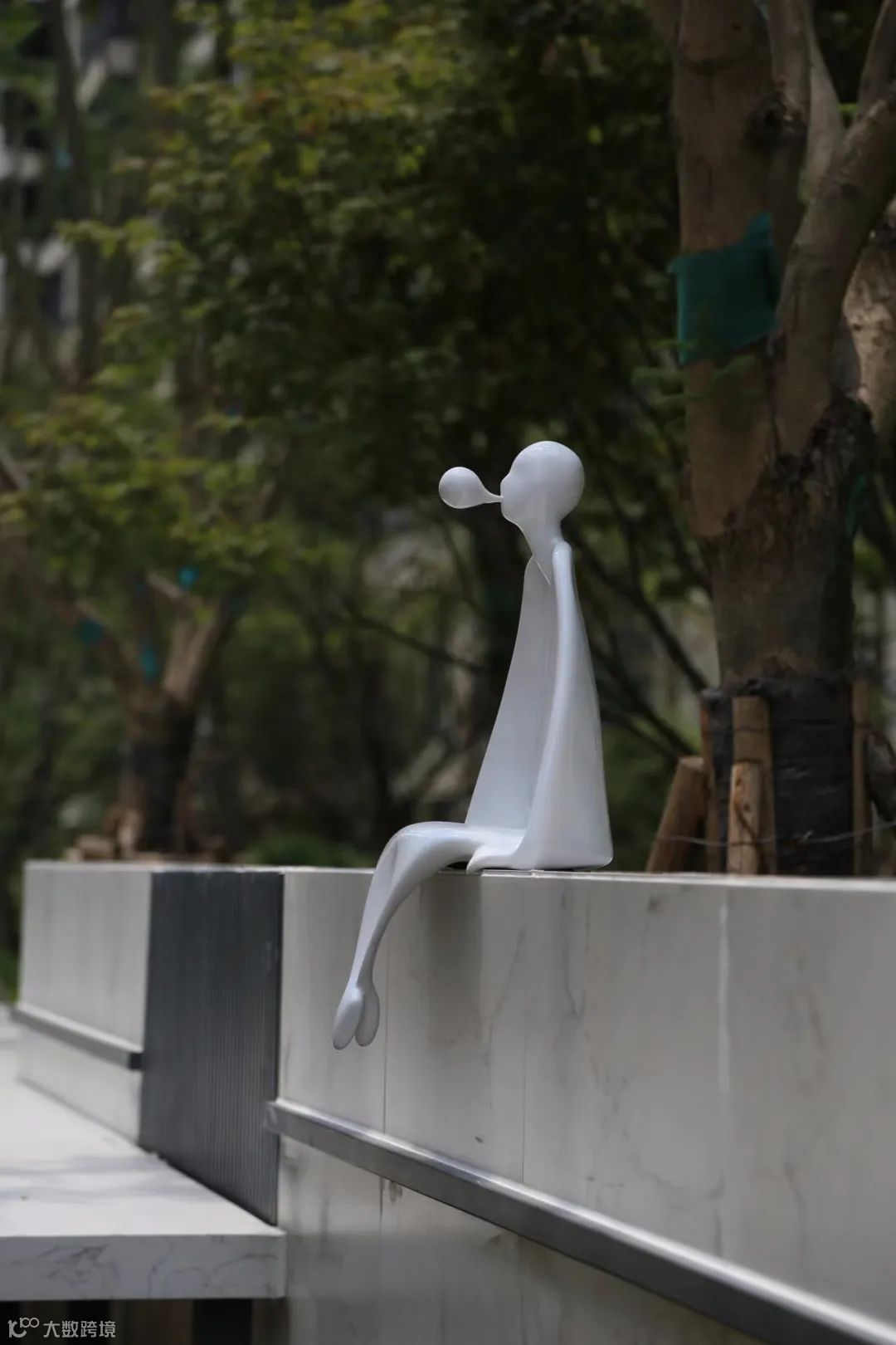 作为两个前后场空间的过渡,打破单一的空间体验与视觉感受。落入翩翩起舞的女孩雕塑,雕塑用镜面不锈钢作为材质表现,却成就一处轻盈之景象。