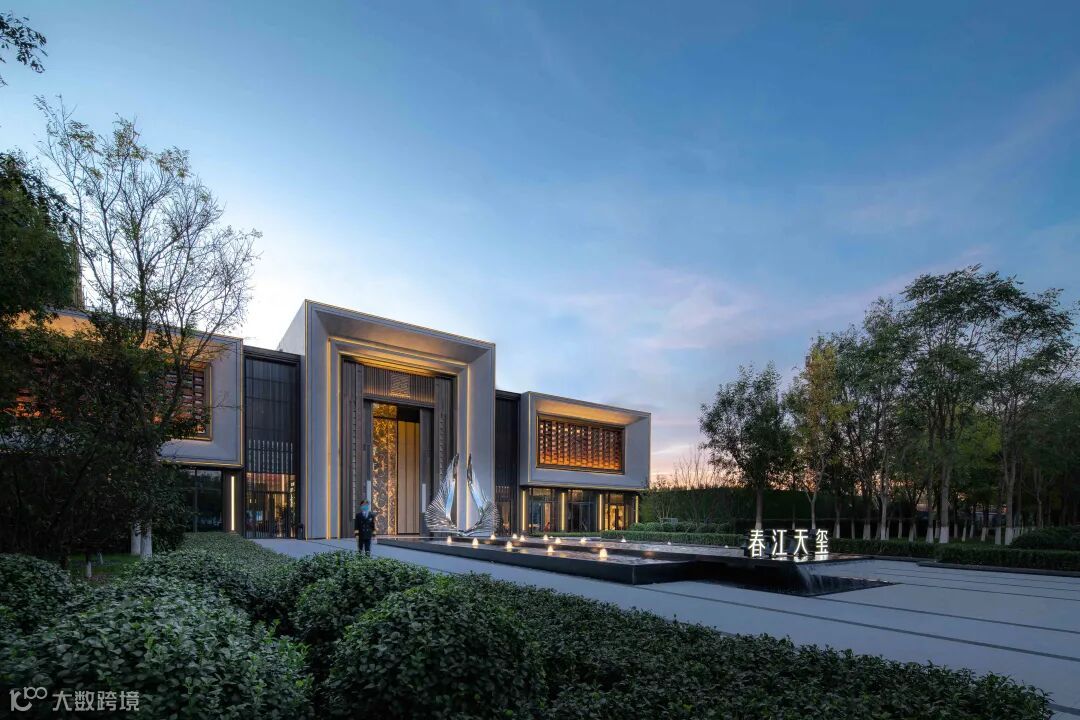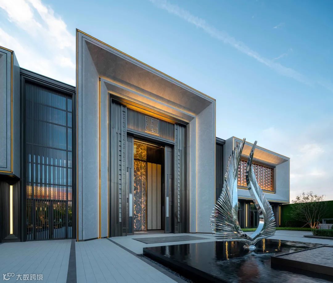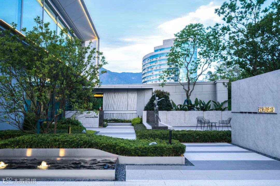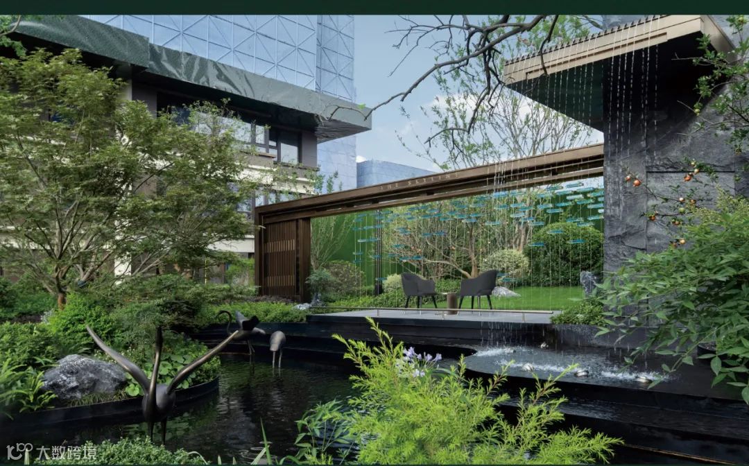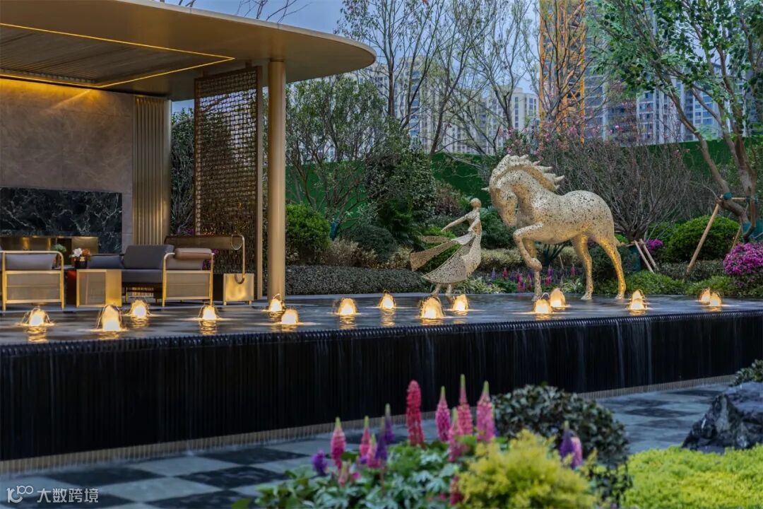 云聚水境:极具山水人文特征的装饰性水景艺术;青铜锈蚀表面,紫铜金箔封边的云聚雕塑隐映在长条板岩手摆的池底,层现出独属这里的归家高级感。