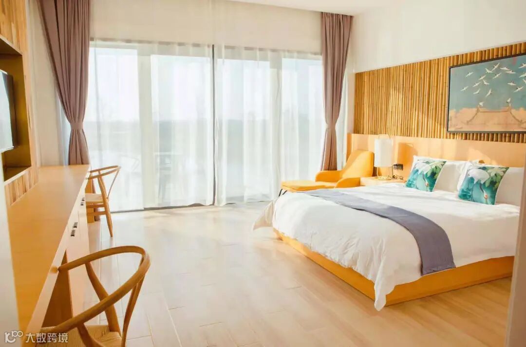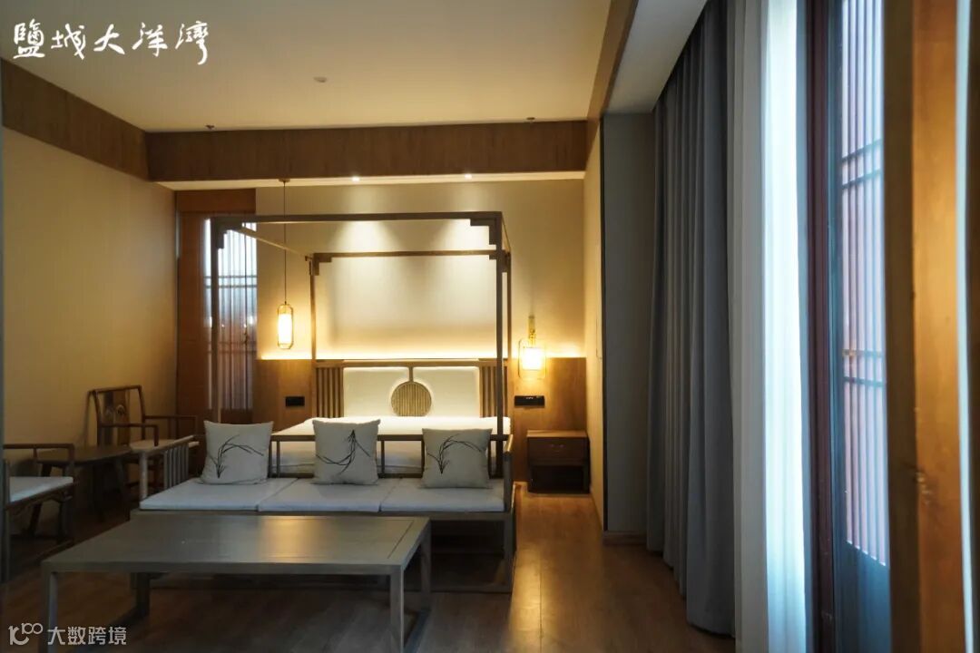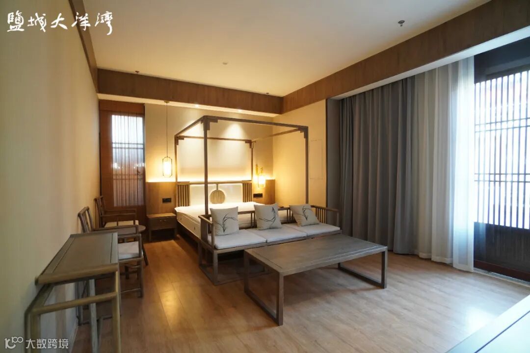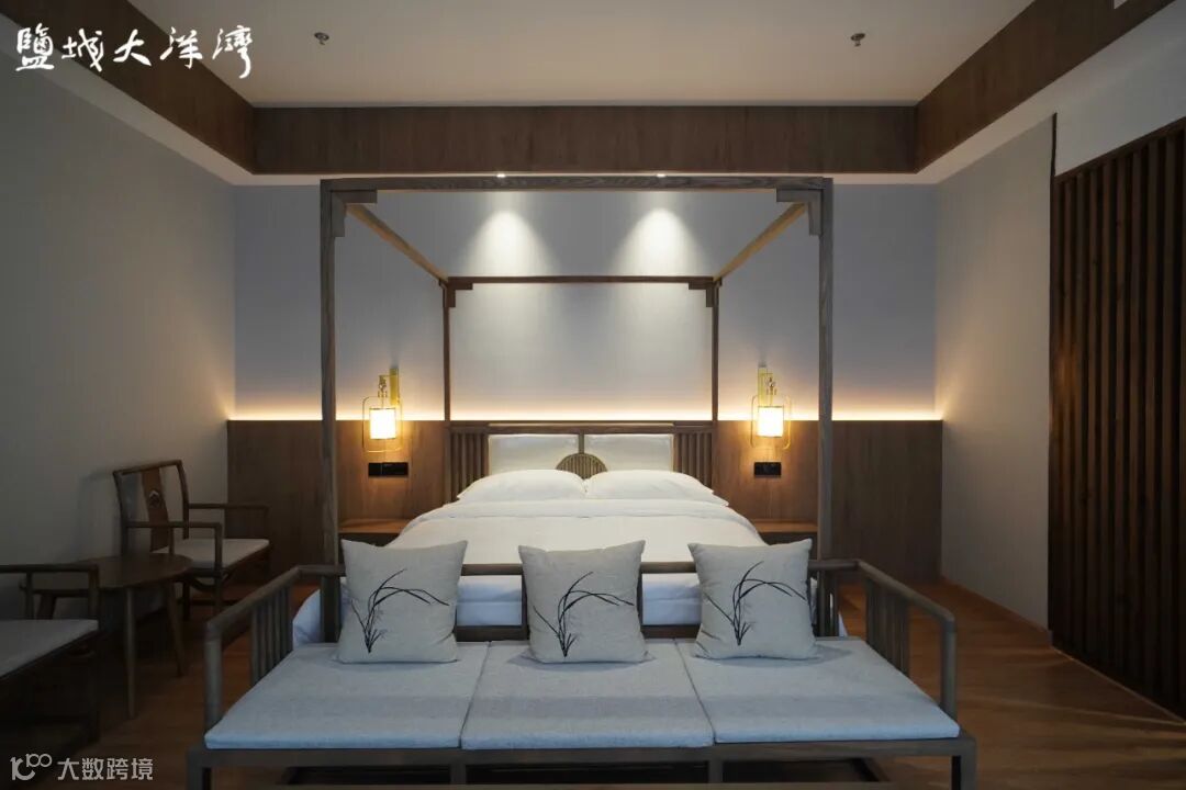 酒店设计上大量采用原木元素,自然原乡的舒适感中,又巧妙结合运用了很多盐城丹顶鹤的元素,中式雅韵十足。