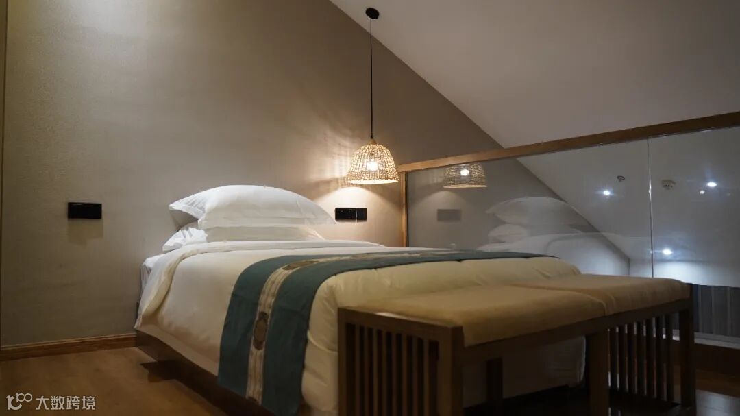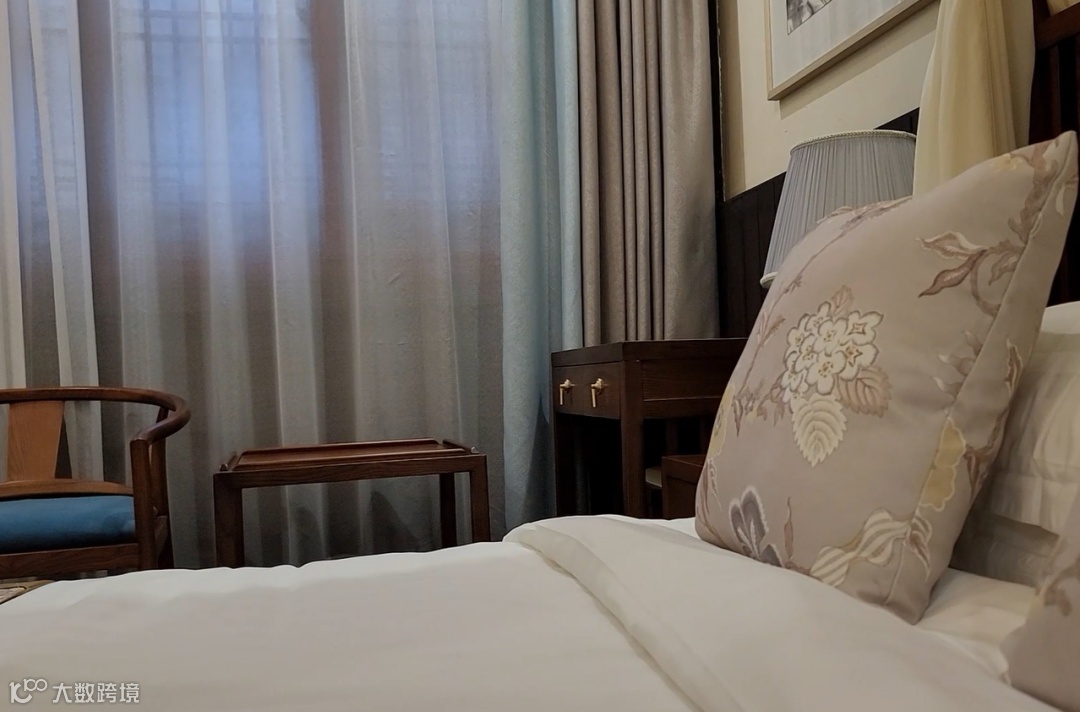 大床房的床架参考唐代的设计利用古代的榫卯结构拼接而成,装修古朴典雅、布置讲究。