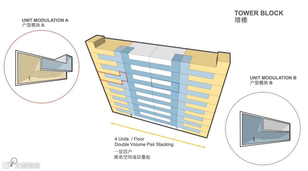 建筑北立面上设有核心筒及设备管井,设计师通过巧妙的格栅设计将其美化,格栅部分主要为厨房和电梯,次卧空间保证朗透,从而保证建筑内部的采光与观景。