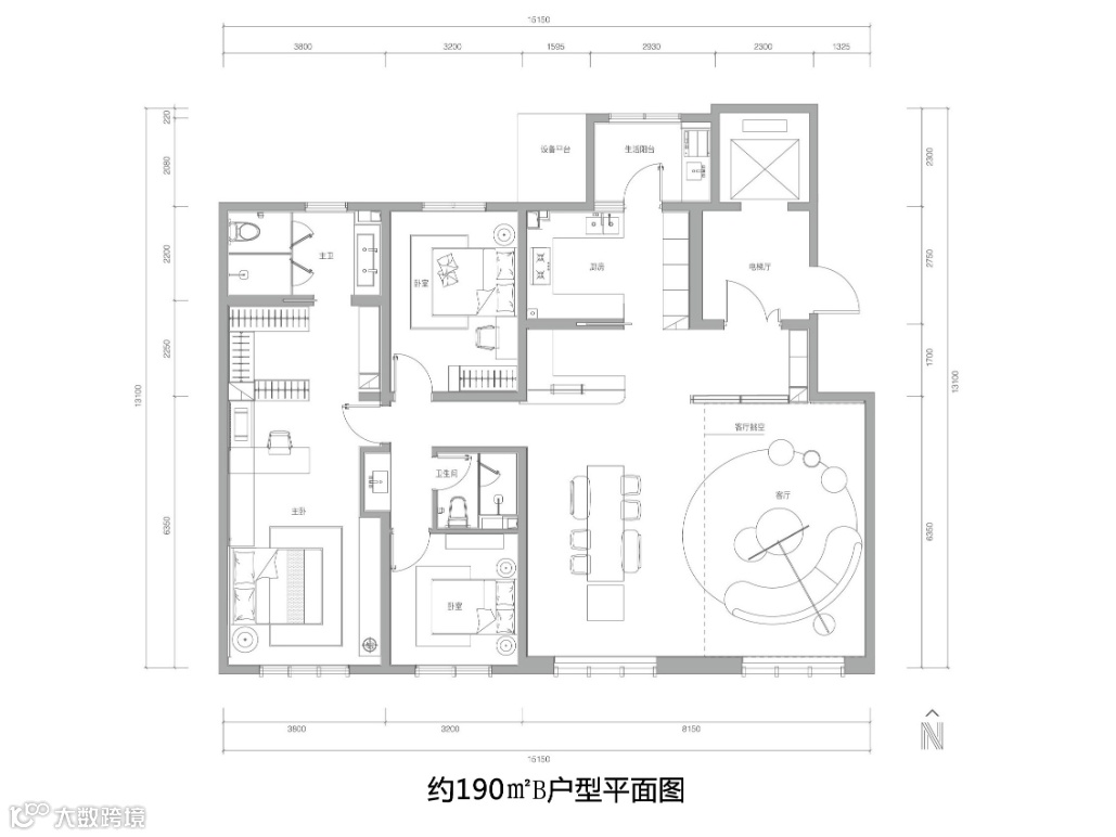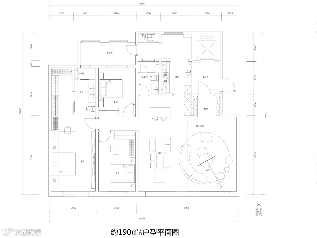 该项目在户型产品的整体规划上强调了纯粹性,完全聚焦于高端人群,严格控制面积段,主要户型为170㎡、190㎡A、190㎡B三款,和一款称为“黑珍珠”的户型,交付面积252㎡。