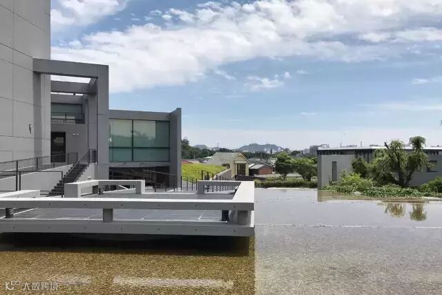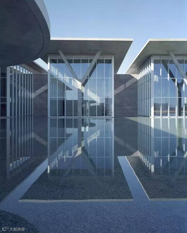 建筑拥有简洁的几何形式,与自然环境相融,选用的材料种类极少。五座长长的平顶展馆仿佛漂浮在1.5英亩的水池上方,波光粼粼。