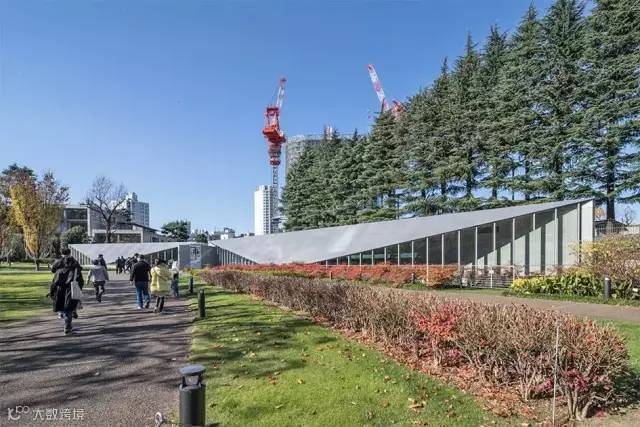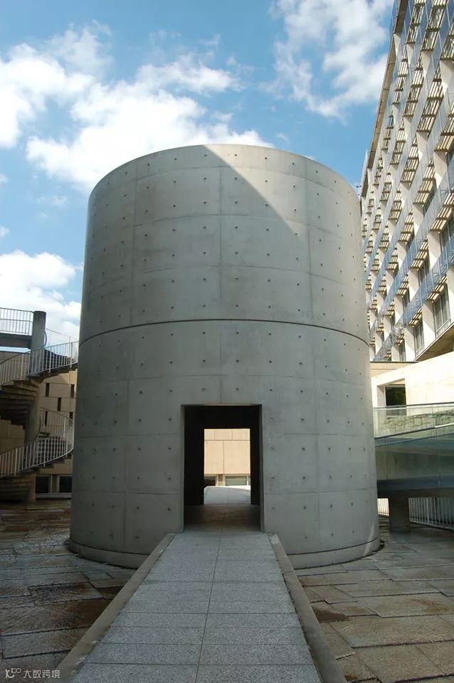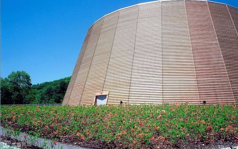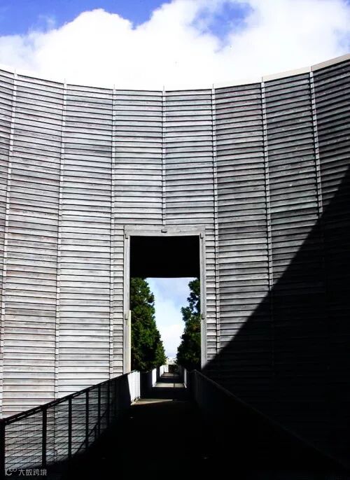纪念馆周遭树林茂密,为了避免纪念馆的量体过于突兀及庞大影响周遭居住环境,安藤将空间向地下延伸,地面上仅露出两层楼高素雅的弧形量体,并利用植栽将建筑物的正面遮掩起来。