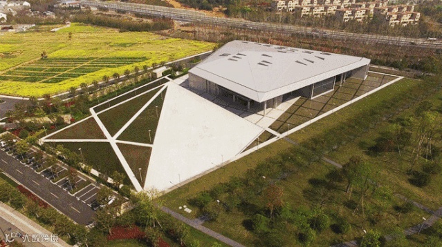 良渚文化村的进村口是一大片田地,建筑设计理念是让整个建筑融于森林之中,远远看去,巨大的几何形屋顶在茂密的树林中探出头,就像是一架“隐形战机”隐匿在翠色的树荫中。