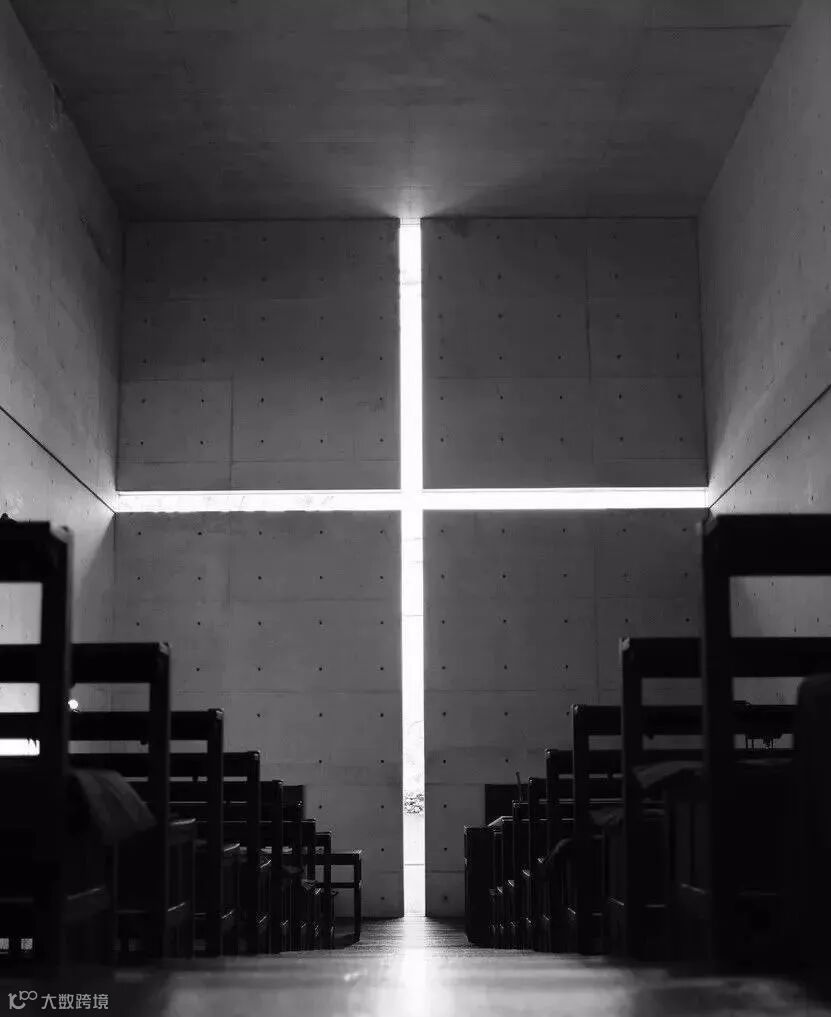 光之教堂的魅力不在于外部,而是在里面,坚实厚硬的清水混凝土绝对的围合,创造出一片黑暗空间,让进去的人瞬间感觉到与外界的隔绝,而阳光便从墙体的水平垂直交错开口里泄进来,那便是著名的“光之十字”,给人神圣,清澈,纯净,震撼之感。