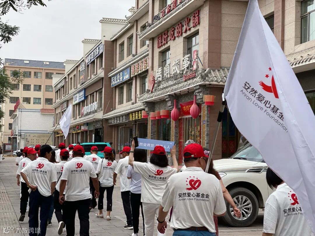 安然爱心志愿者手举爱心基金会旗帜传播爱心行为,步行前往献血点。