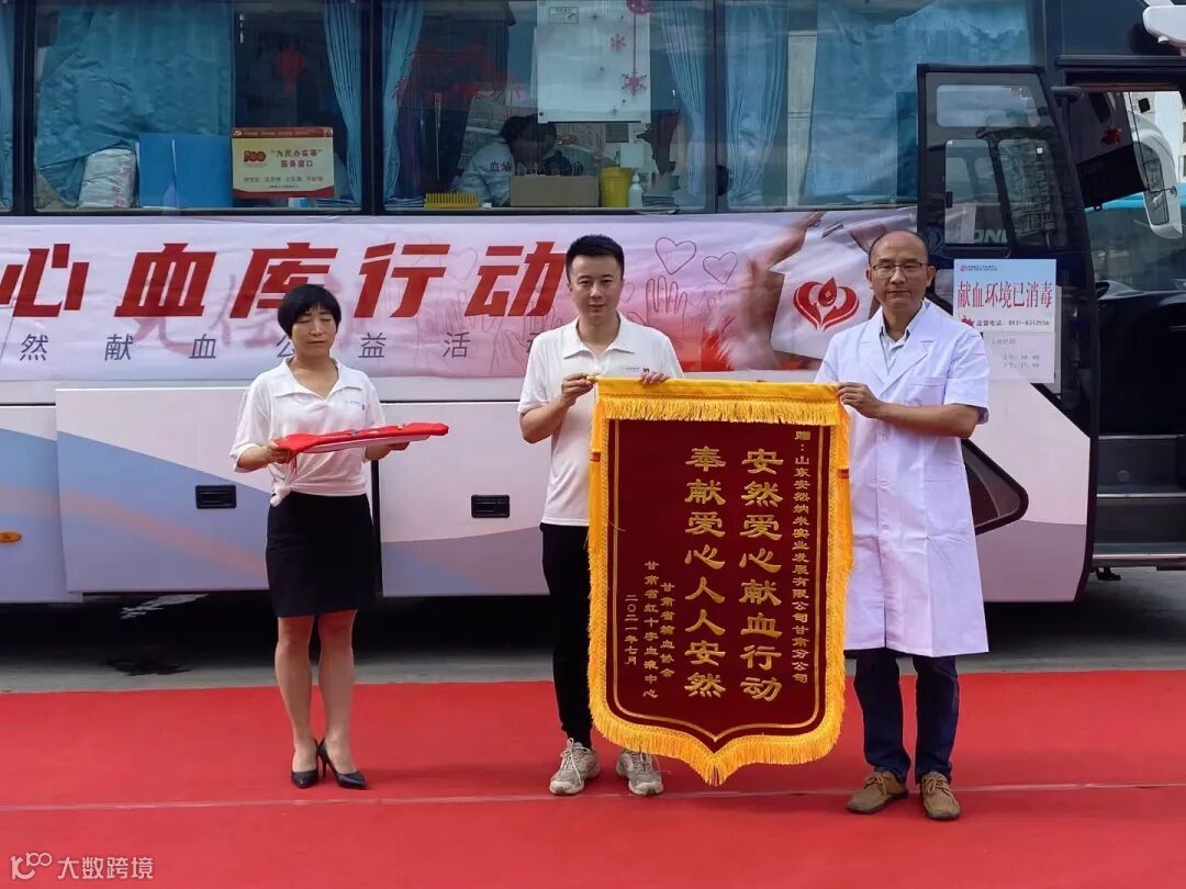 甘肃省红十字血液中心并为安然甘肃分公司这一善举赠予了爱心锦旗,同时甘肃分公司负责人孙维楠经理向血液中心赠送安然企业文化手册。