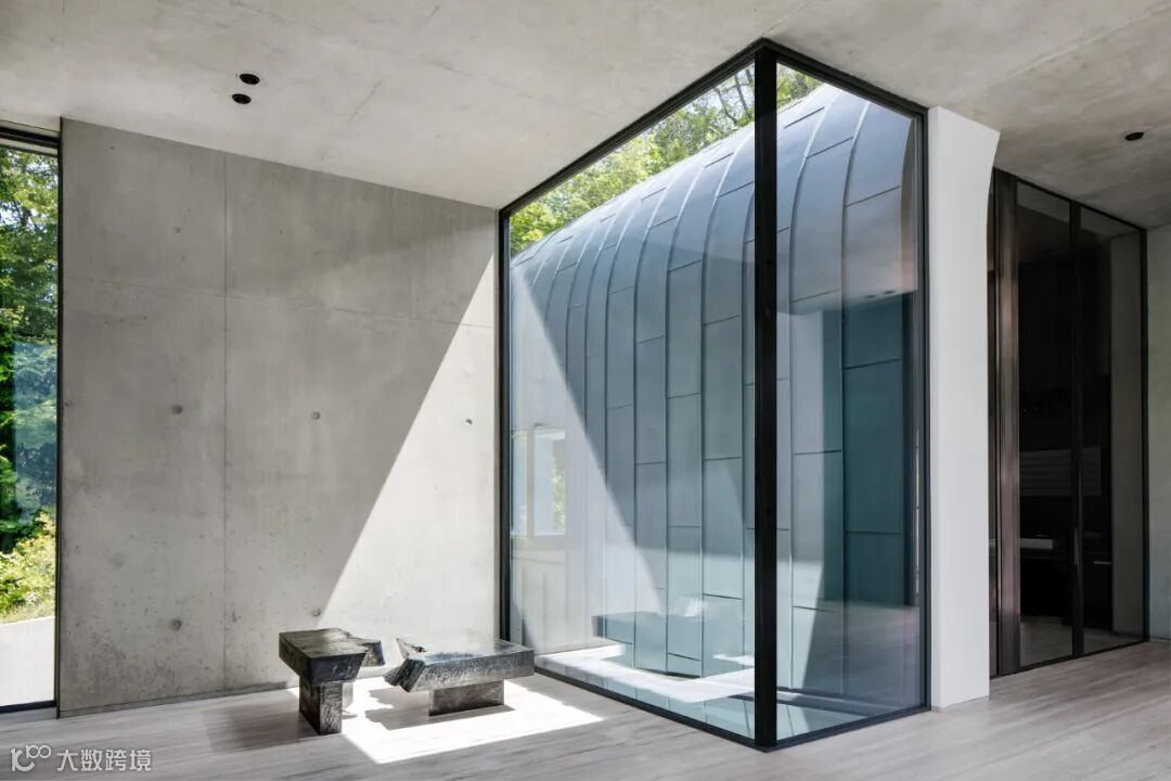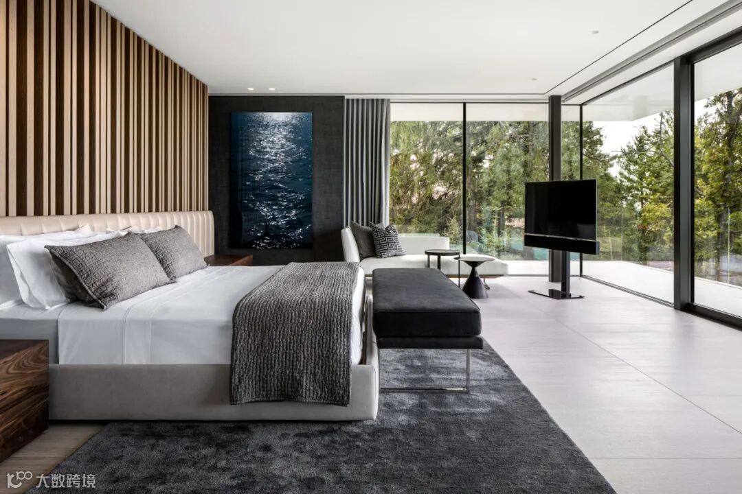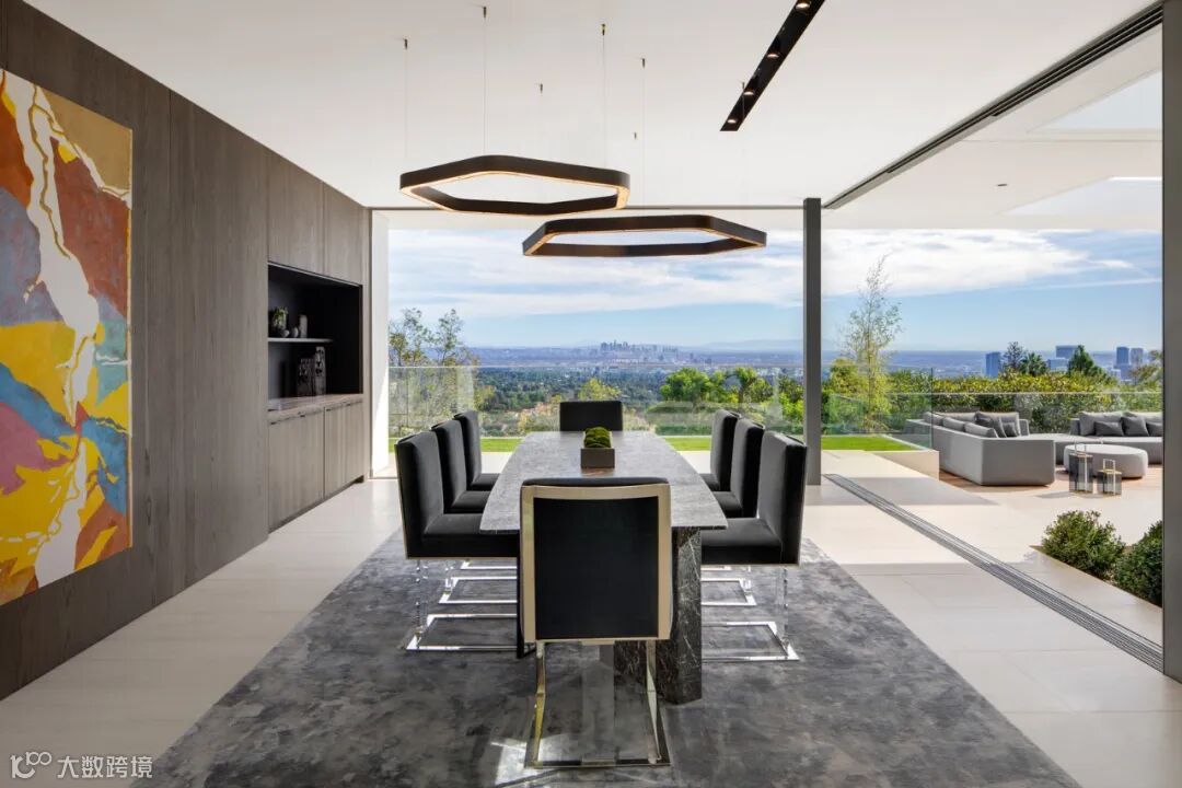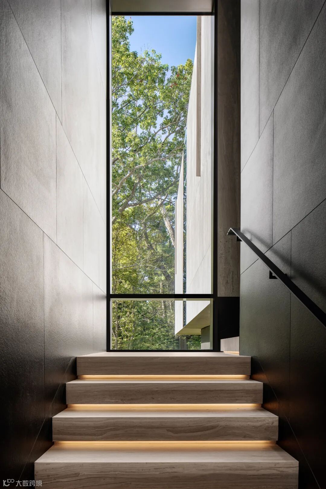 住宅的退让结构顺应山坡地形,分三层而建。顶层的视野尤为开阔,布置为主要的生活空间,包括开放式厨房、餐厅和起居休闲的区域;家庭工作区和卧室位于二层;车库、健身房、家庭影院和客房则位于底层。