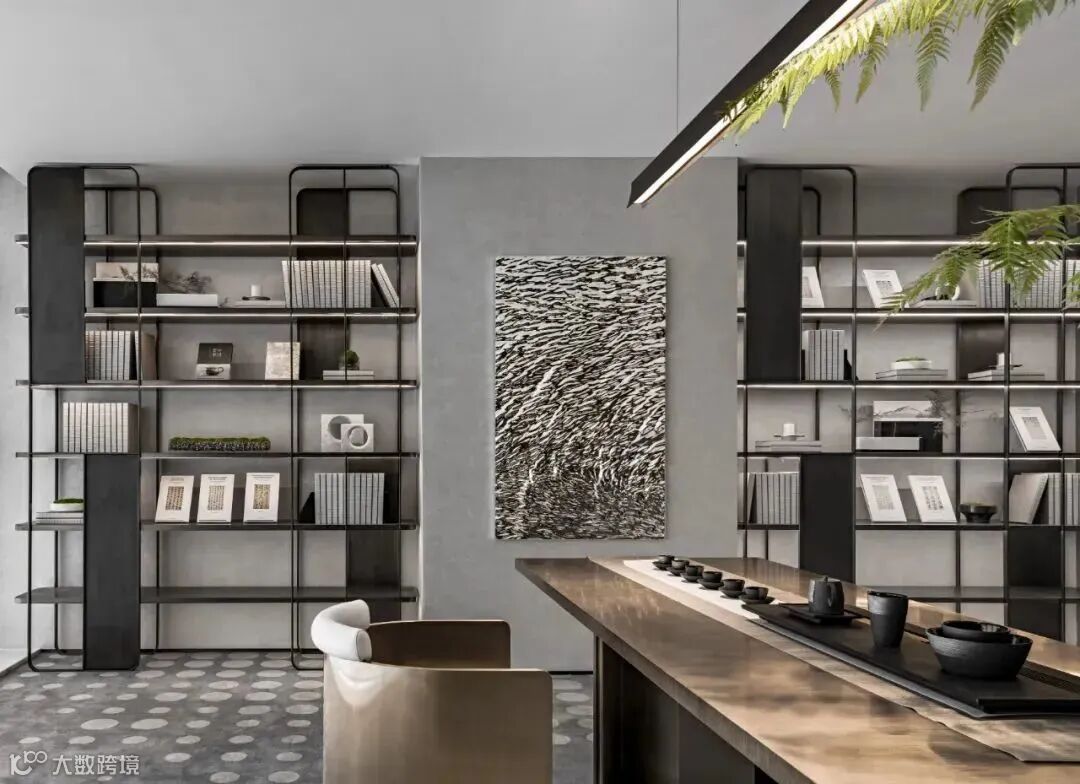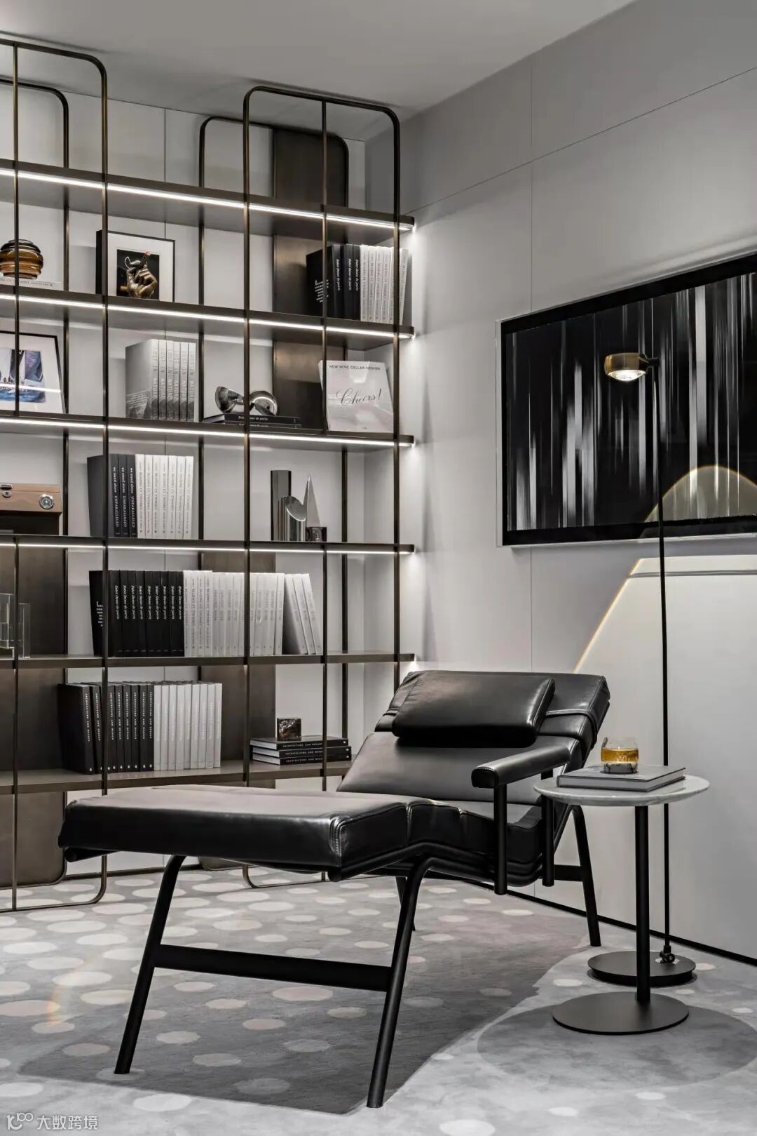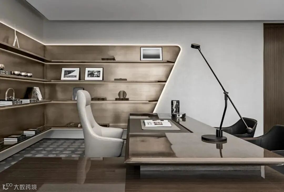 雅致的木,波光粼粼的挂画,一二陈设,用简单的设计语言文雅地描绘着空间意境。总裁办公室采用灰白金的色调,选用简约的家具和饰品,营造高级的商务感,展示区除了放置一些艺术品外,还会放置与空间主人生活爱好相关的饰品,如出海旅行的照片、航海模型等。