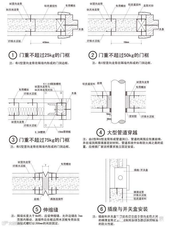 ⑤ 隔墙高度≥5000mm时,为保证墙体稳定性,应考虑采用不同龙骨骨架结构(双排、对扣等)或钢结构框架(内隐藏)方式,增加墙体限制高度。