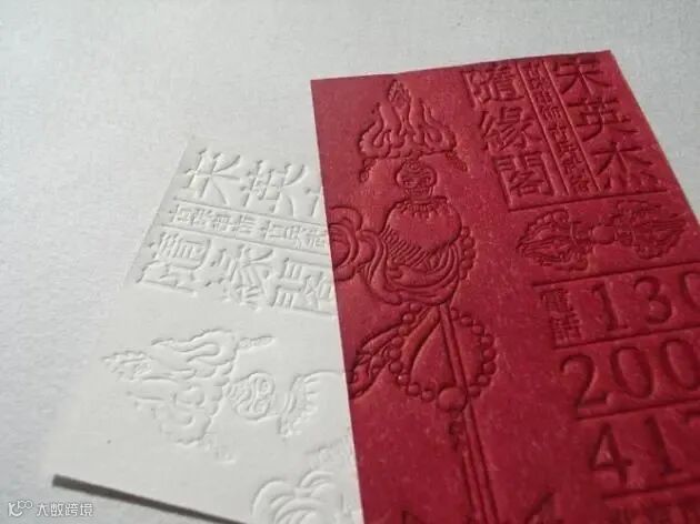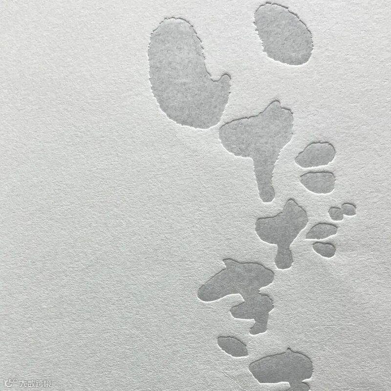 雪之子的灵感源于“雪地上的脚印”,雪的白皙松软和脚印的穿透铭刻,这种突出纸张白色与透明之间的差异达到立体感、凹凸感更加强烈的效果是烫透纸最大的特点。与热压变深色的其他纸张效果相比,有着截然不同的视觉效果。烫透面积大的可以看到底下衬纸的颜色和字迹,同理,可以在的烫透的反面反印一些图案或暗记,可以收到同样的效果。