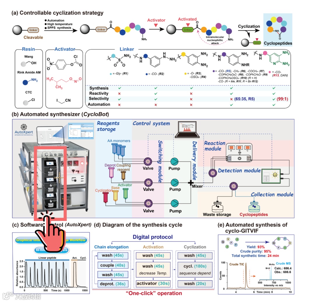 研究人员只需输入目标环肽的“数字配方”,CycloBot即可对整个合成过程进行实时监测。李承喜研究员团队自主开发的控制软件 AutoXpert,能够自动完成液体转移、试剂混合和反应条件控制等步骤,并像“眼睛”一样追踪反应进程,根据数据反馈进行智能微调。无论是含有非天然氨基酸的复杂环肽,还是不同大小的环状结构,都能高效合成。设备的通用性让环肽合成从一项依赖经验的“手工艺制造”,转变为可编程的“数字化智造”。