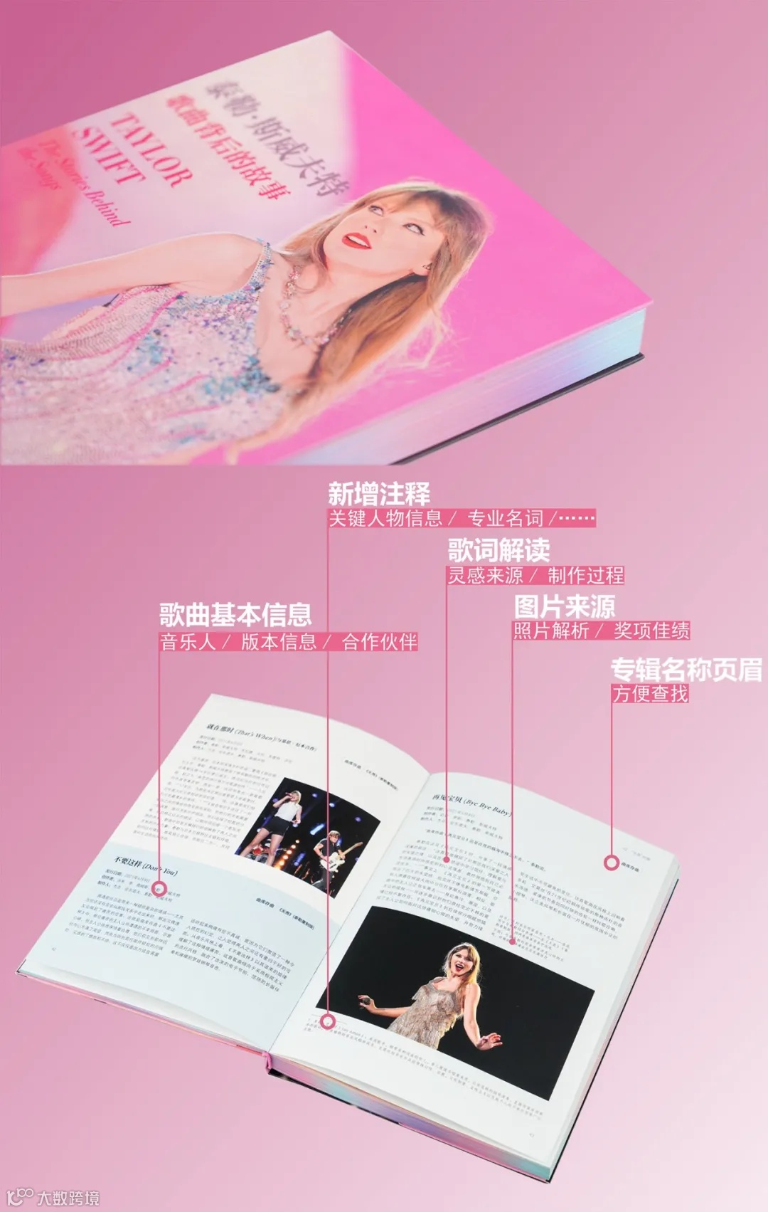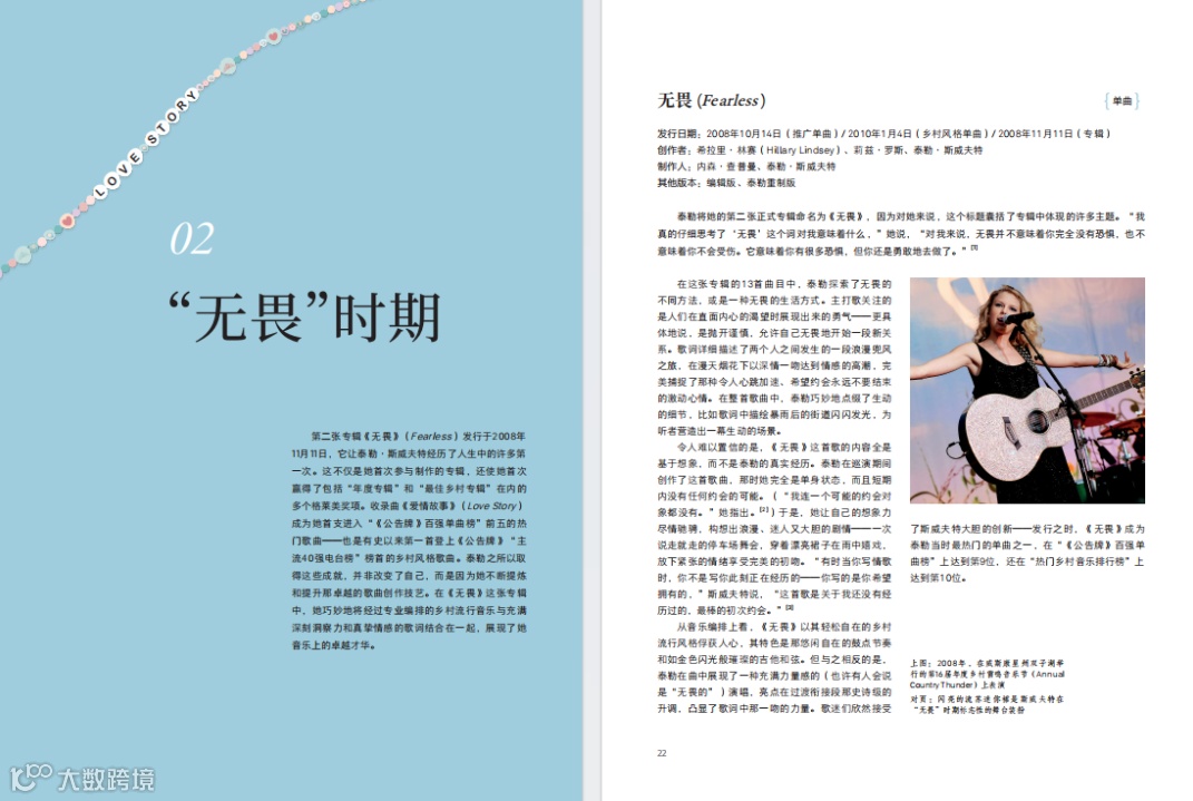除了文字内容外,书中还收录了180余幅泰勒的高清图片,包含了不同专辑时期的经典造型:流苏裙+牛仔靴、字母T恤+黑色礼帽、露腰两件套、亮片裙、绿色飘逸长裙……所有图片都经过严格的颜色校准,以求最大限度地还原霉霉的美貌。