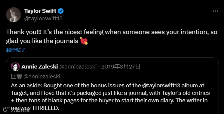 作者安妮·扎勒斯基与泰勒·斯威夫特在X(旧twitter)上的互动