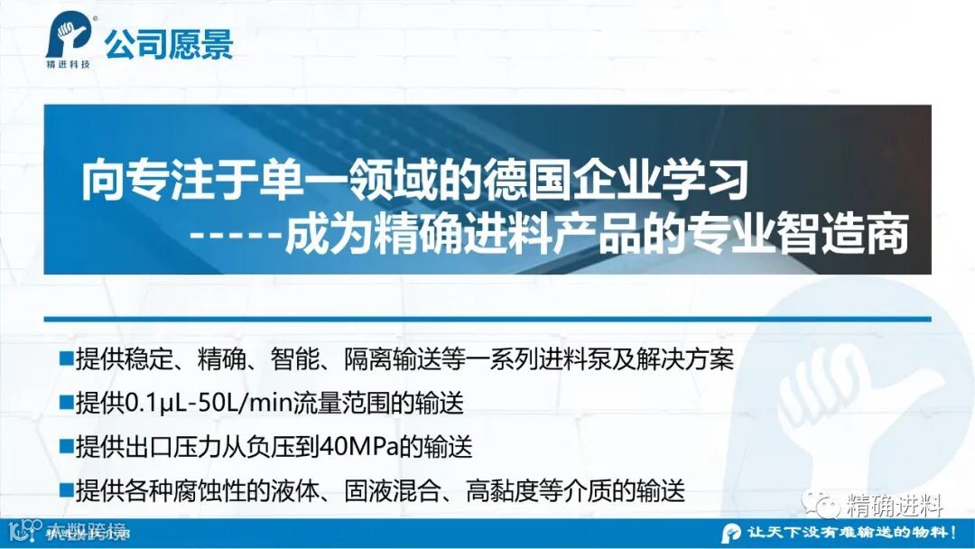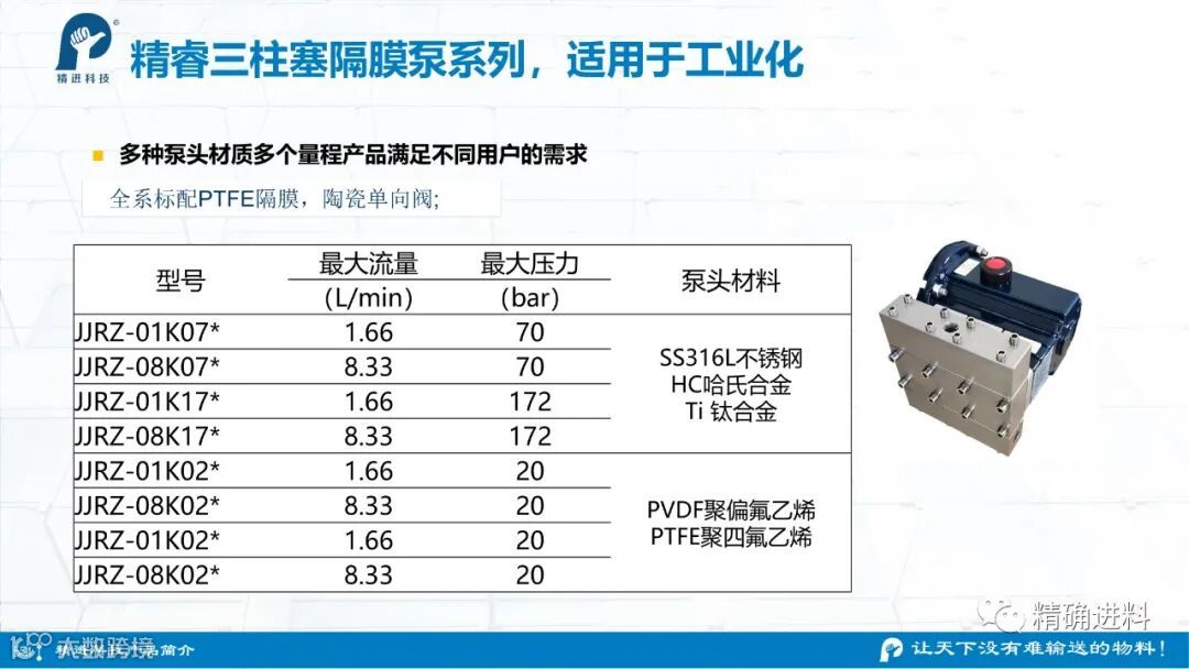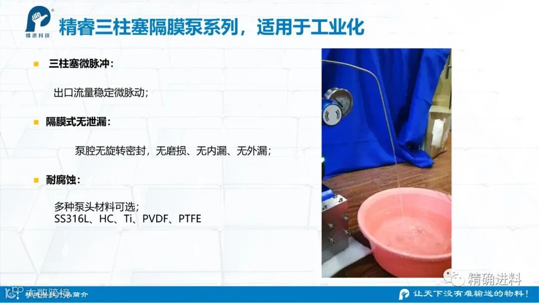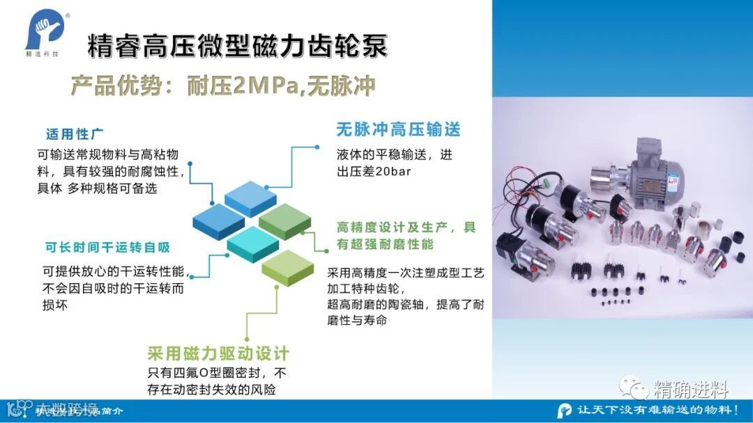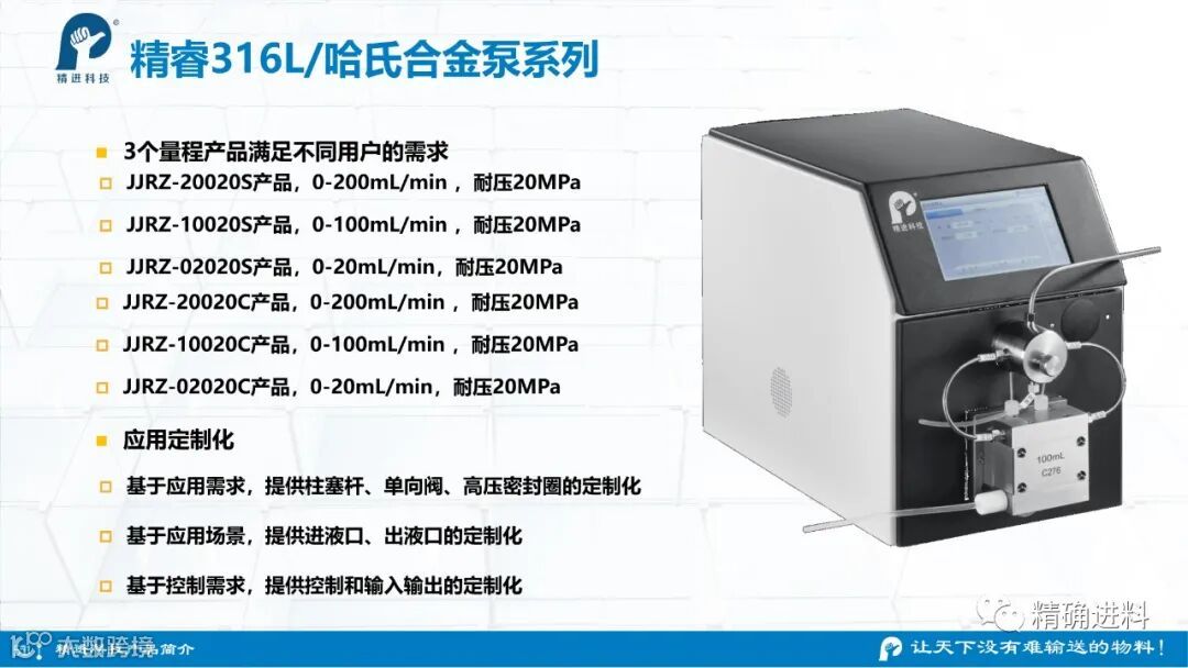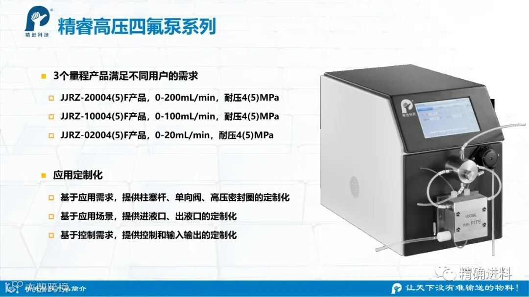 杭州精进科技有限公司作为一家致力于“精确进料”技术及产品研制的高科技公司,所有产品自主研发,拥有自主知识产权,公司目前已经建立了标准化研发、生产的完整体系,提供稳定及标准化的产品。拥有精睿高压四氟泵、精睿不锈钢柱塞泵、精睿哈氏合金柱塞泵等。
