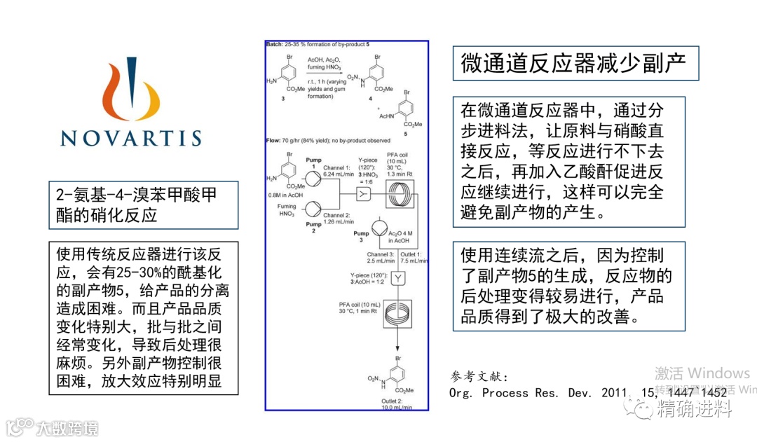 这是诺华制药研发的2-氨基-4-溴苯甲酸甲酯的硝化反应,在传统的釜式反应中,会有25-30%的酰基化的副产物5,给产品的分离造成困难。而且产品品质变化特别大,批与批之间经常变化,导致后处理很麻烦。另外副产物控制很困难,放大效应特别明显。