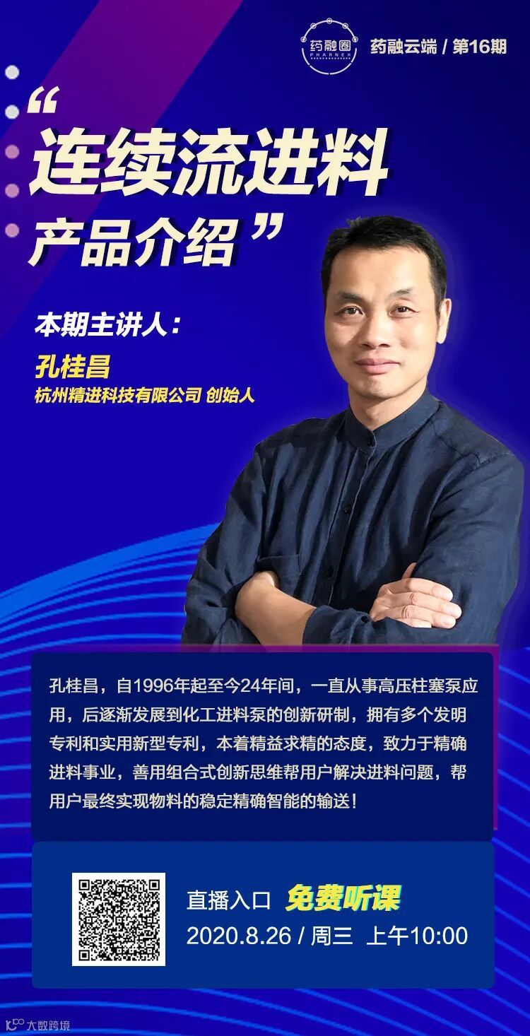 8月26日(周三)上午10:00,药融圈特邀杭州精进科技有限公司创始人 孔桂昌做客药融云端线上直播间,对“连续流中进料问题探讨”做专题分享,欢迎积极参与!