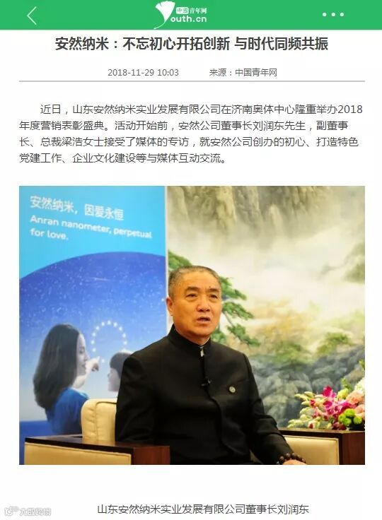2018年11月29日,中国青年网发表了题为“安然纳米:不忘初心开拓创新 与时代同频共振”的专题报道。