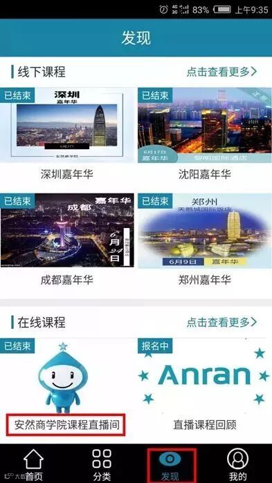也可通过安装《安然通》手机APP并找到下面菜单中的“发现”里的“在线课程”中的〈安然商学院课程直播间〉进行观看。