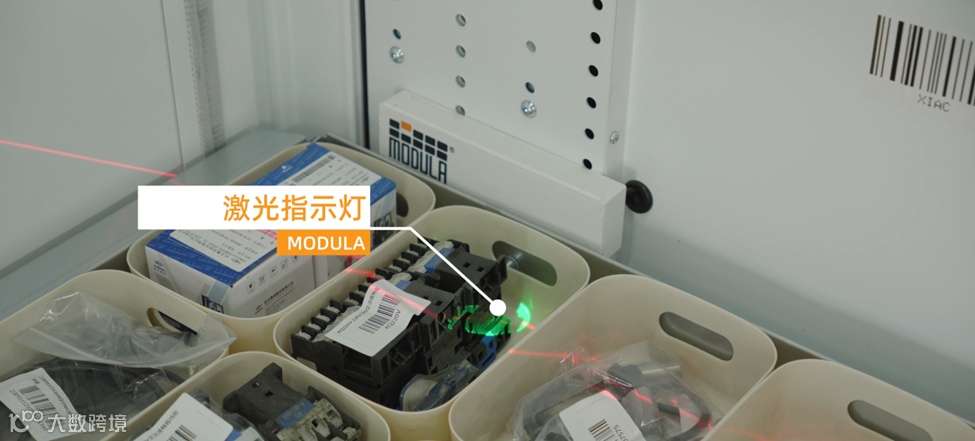 2. 为了能更好地提高操作人员的拣选速度和精准度,客户还为货柜配备了激光指示灯, 激光指示灯会将光点投射在具体库位上, 方便操作人员快速准确地在托盘中找到待拣选的物料。