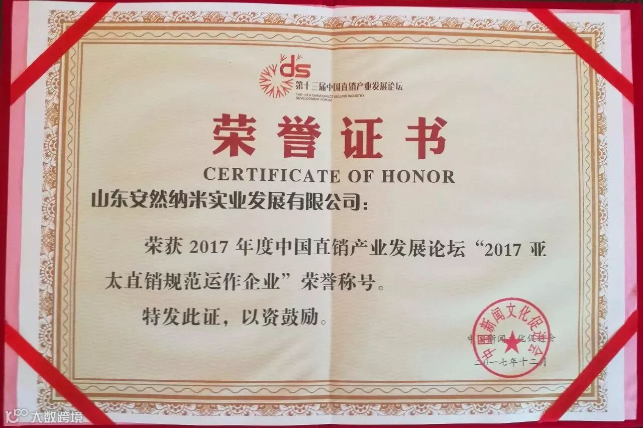 此次盛典现场,安然公司凭借超凡的表现以及在直销行业的不懈努力与坚持,将“2017亚太直销规范运作企业”收入囊中。实至名归的荣誉再一次彰显了安然稳步上升的实力及投资价值,激发了安然人的创业激情与斗志!伴随着国家“健康中国”战略的逐步推进实施,相信在不久的将来,安然终将成为全国健康传播新名片。