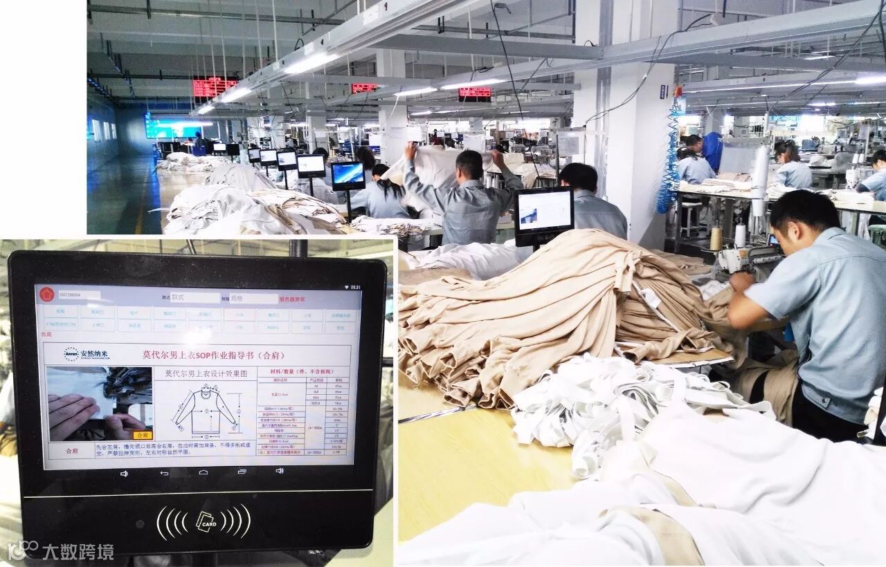 这是缝制工人们在流水缝制无缝弹力套服,你看到他们面前的小屏幕了吗?那是MES系统的流程跟踪机器。