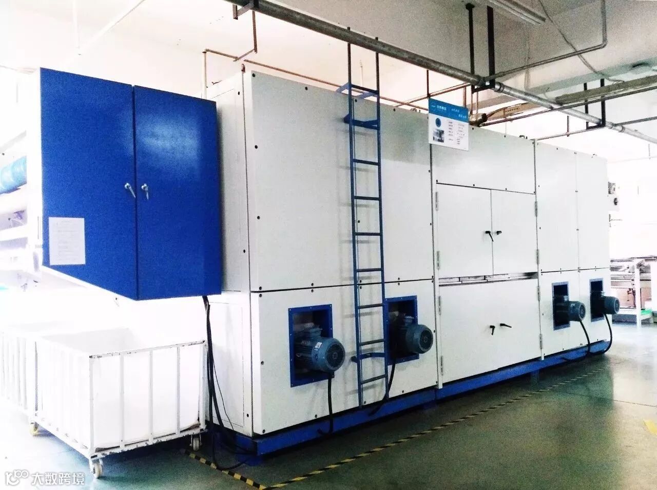 经过拉伸,就会进入烘干机。从烘干机的一侧进入,半分钟后就会从另一侧出来,不带一点水分哦!为我们的高科技鼓掌吧!
