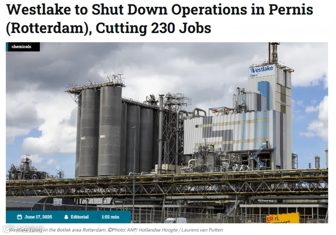 6月18日,美国化工巨头Westlake突然宣布关闭荷兰佩尔尼斯工厂,涉及15万吨双酚A及10万吨液体环氧树脂产能,裁员230人。关停主因“欧洲业务持续恶化”,预计承担1.9亿欧元关停成本(含环境修复费用1.6亿欧元)。该工厂曾是欧洲反倾销关税的核心支持者,2024年其联合Olin等企业推动欧盟对中国等征收临时关税,曾导致环氧树脂价格飙升至2600欧元/吨。讽刺的是,2025年6月欧洲市场价格已回落至反倾销前水平,印证关税保护难敌需求塌陷。