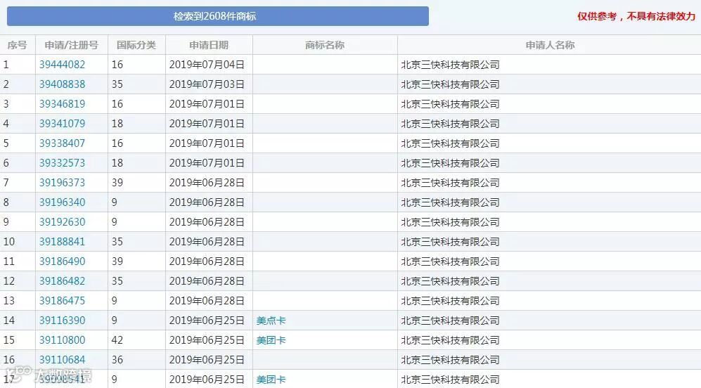 例如美团,在成立不久后就进行了商标注册布局。在商标局官网,一共可以检索到2608件美团商标,包括“美团”、“美团网”、“MEITUAN”、“美团点评”等商标,涵括多个类别,可见美团对于知识产权保护的高度重视。