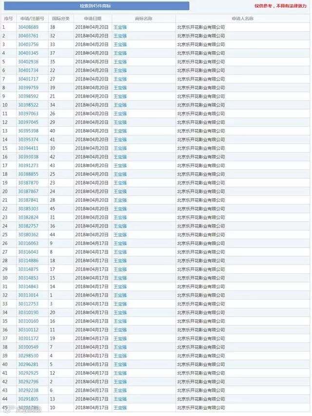 也许是受到了姓名被“抢注”的启示,王宝强在2018年4月17日通过旗下公司北京乐开花影业有限公司一口气申请了全类45个商标,对自己的名字“王宝强”进行了全面、完整的商标保护,防止其他人傍名牌,搭便车,损害自己的人格利益、财产利益以及消费者的合法权益。