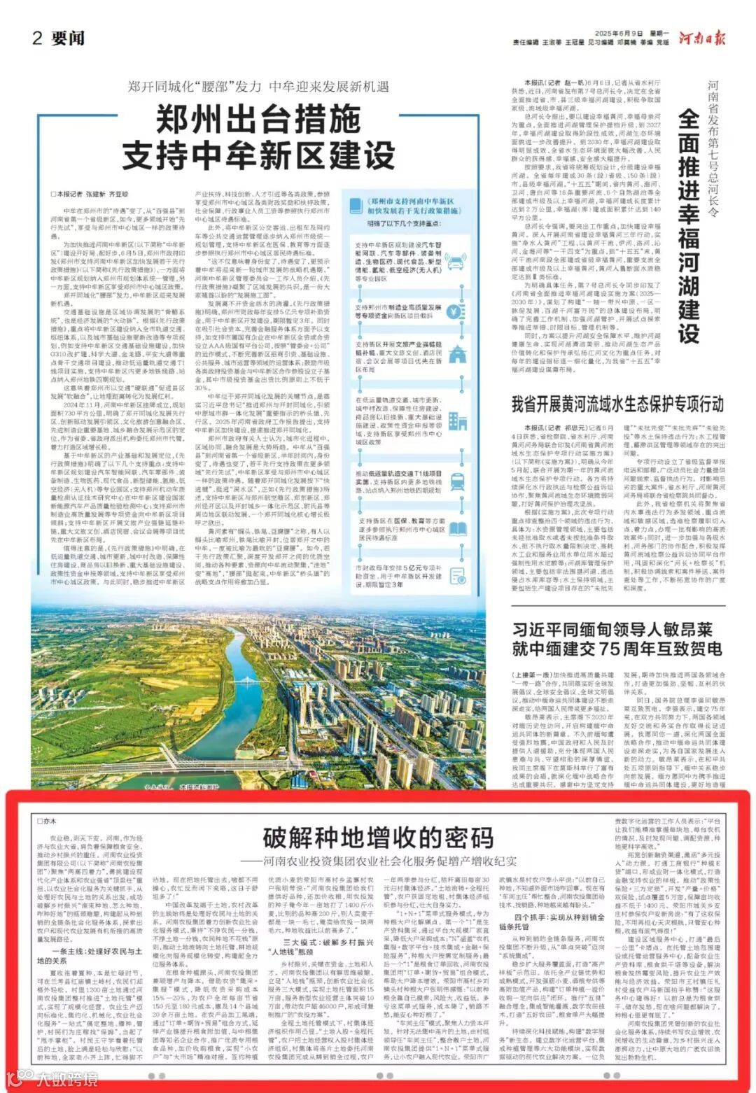 农业稳,则天下安。河南,作为经济与农业大省,肩负着保障粮食安全、推动乡村振兴的重任。河南农业投资集团有限公司(以下简称“河南农投集团”)聚焦“两高四着力”,勇挑建设现代化产业体系和农业强省“顶梁柱”重担,以农业社会化服务为关键抓手,从处理好农民与土地的关系出发,成功破解乡村振兴“谁来种地、怎么种地、咋种好地”的瓶颈难题,构建起从种到销的全链条社会化服务体系,探索出农户和现代农业发展有机衔接的高质量发展路径。