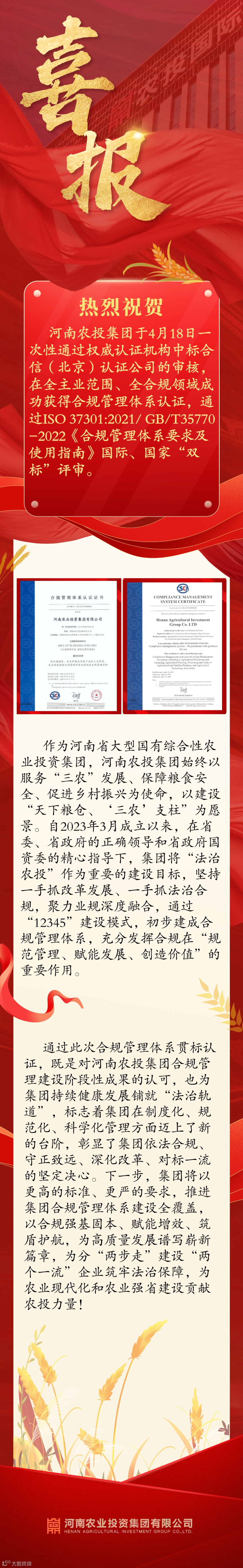 【喜报】河南农投集团获合规管理体系国际国内“双认证”!