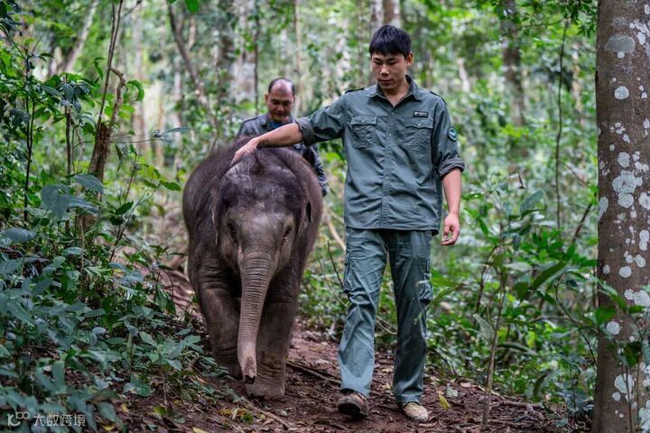 2024年12月8日,西双版纳亚洲象救护与繁育中心工作人员莫诗宇(右)、陈继铭带小象到野外开展训练。新华社记者 胡超 摄
