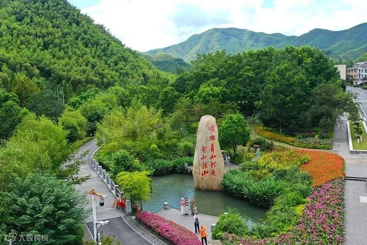 2025年8月6日,在浙江省湖州市安吉县余村,游客在刻有“绿水青山就是金山银山”的石碑前留影(无人机照片)。新华社记者 毛竹 摄