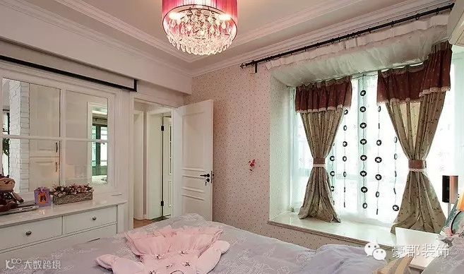 ▲ 小公主的房间,白色家具、小碎花壁纸、粉色水晶灯、蕾丝窗幔