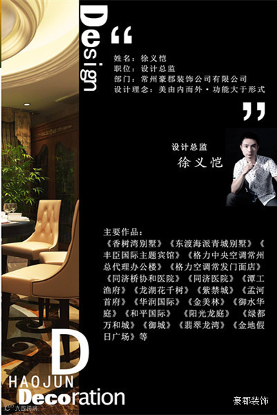 豪郡装饰的解析:豪:男人的豪爽。郡:女人的细腻。装修过程中必须有男人的豪爽,过程和细节中要有女人的细腻,装修才能完美……。“豪郡装饰”想告诉你:我们是刚柔并济,粗中带细。对内我们提倡尊重、信任、崇尚团队精神,对外强调诚实、信用、坚持质量第一。想知道常州装饰哪家强,快来兰陵找豪郡!