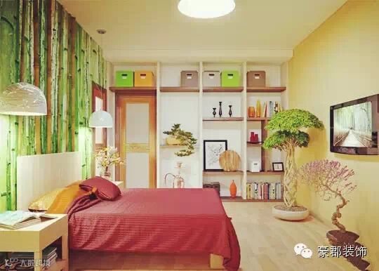 绿色竹子图案的床头背景墙,大红色被褥,米黄色壁纸,木质地板,绿色盆栽,各种颜色碰撞一起,形成强烈的视觉冲击力,展现青春活力空间。多个格子陈列架的混合色彩搭配,不仅巧妙地装饰了墙壁,还尽显空间的收纳功能,整体给人青春时尚的视觉效果。